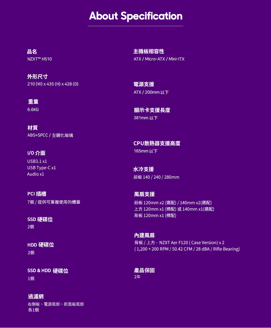 NZXT H510 白紫 顯卡長38.1/CPU高16.5/ATX(H510B-BR)(台灣限定版 限量發售)