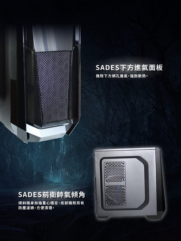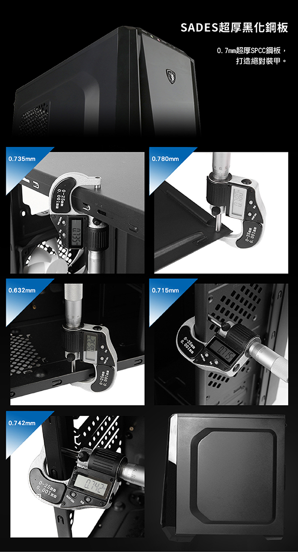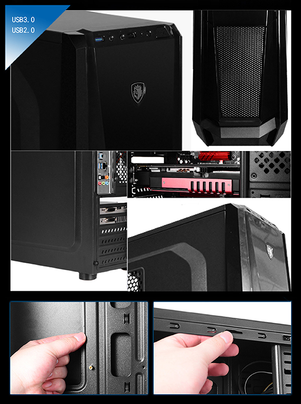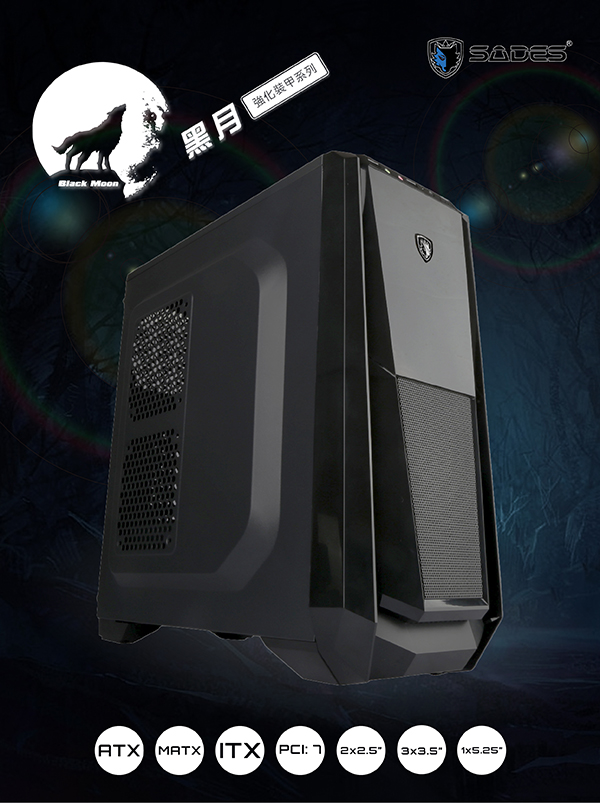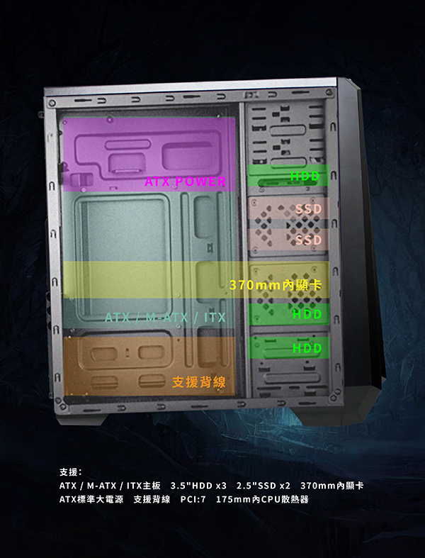產品型號:黑月 Black Moon 強化裝甲 產品顏色:黑色 產品尺寸: D380 X W185 X H440 產品材質: 0.7超厚SPCC 內部結構: 上置電源 主機板相容性:ATX, MATX, ITX 硬碟裝置: 3.5X3 , 2.5X2 散熱系統: 前12CM X 2(選配) , 側12CM X 2(選配) , 後12CM X 1 (選配) 前置接口: USB 3.0 X 1 , USB2.0 X 1 特殊功能:下方進氣網孔面板 淨重: 4.3 KG PCI擴充插槽:7 顯卡支援長度: 370 mm CPU散熱器支援高度:175 mm ※以上規格資料若有任何差異,以原廠所公佈資料為準。