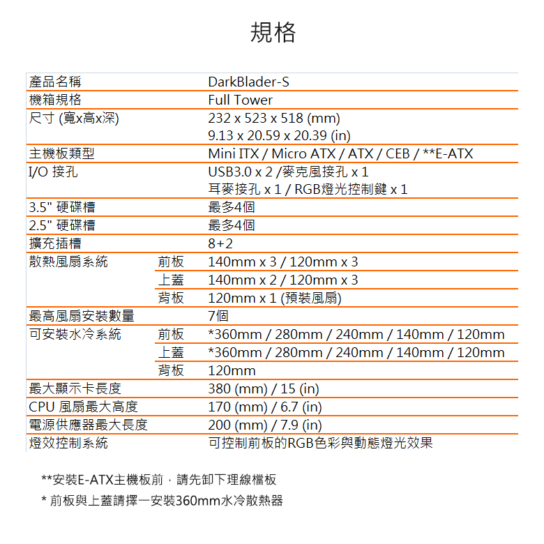 • COUGAR Dark Blader-S 顯卡長38/CPU高17/E-ATX