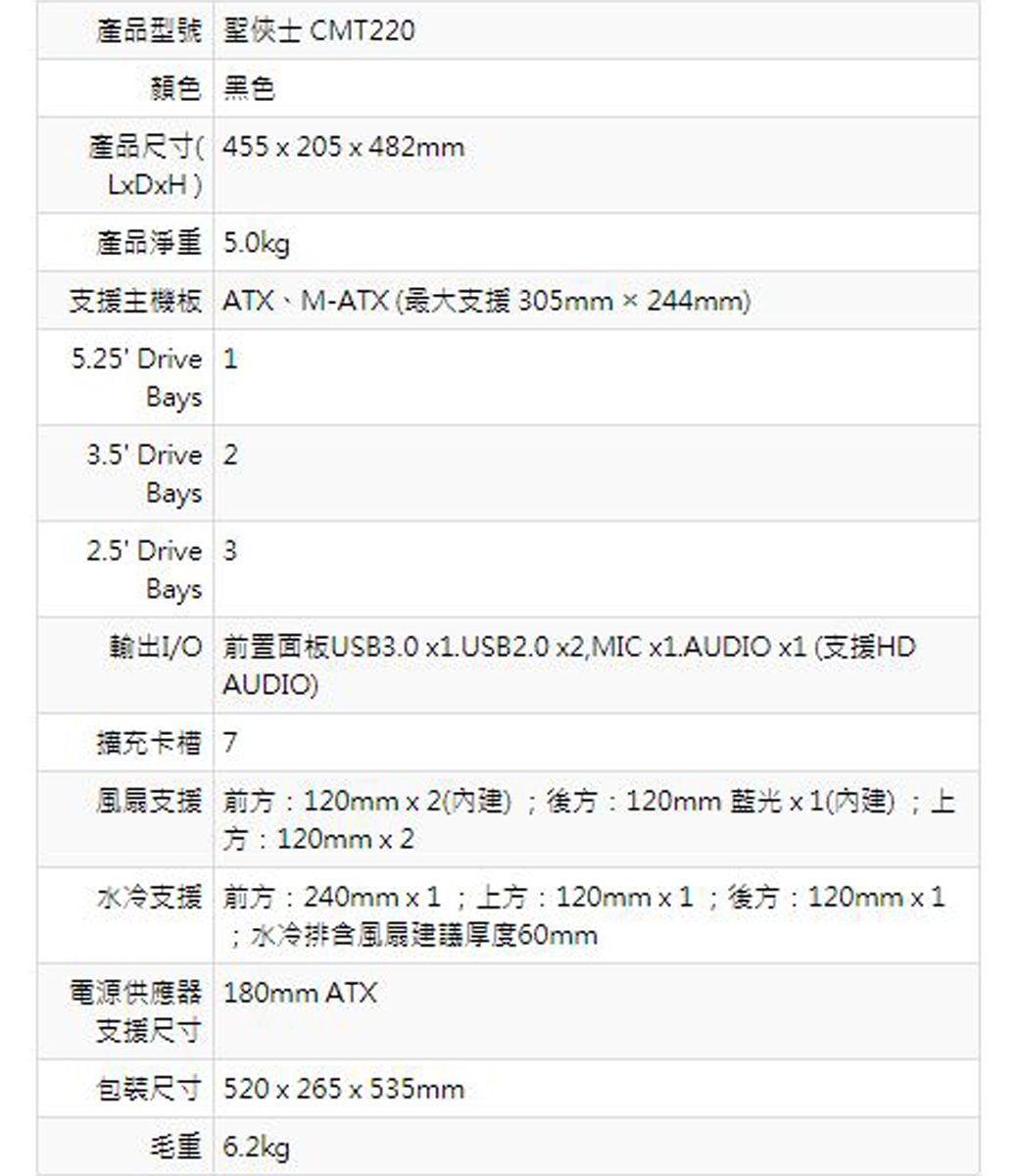 • 全漢 CMT220 聖俠士 顯卡長40/CPU高16.3/SSD*3/ATX