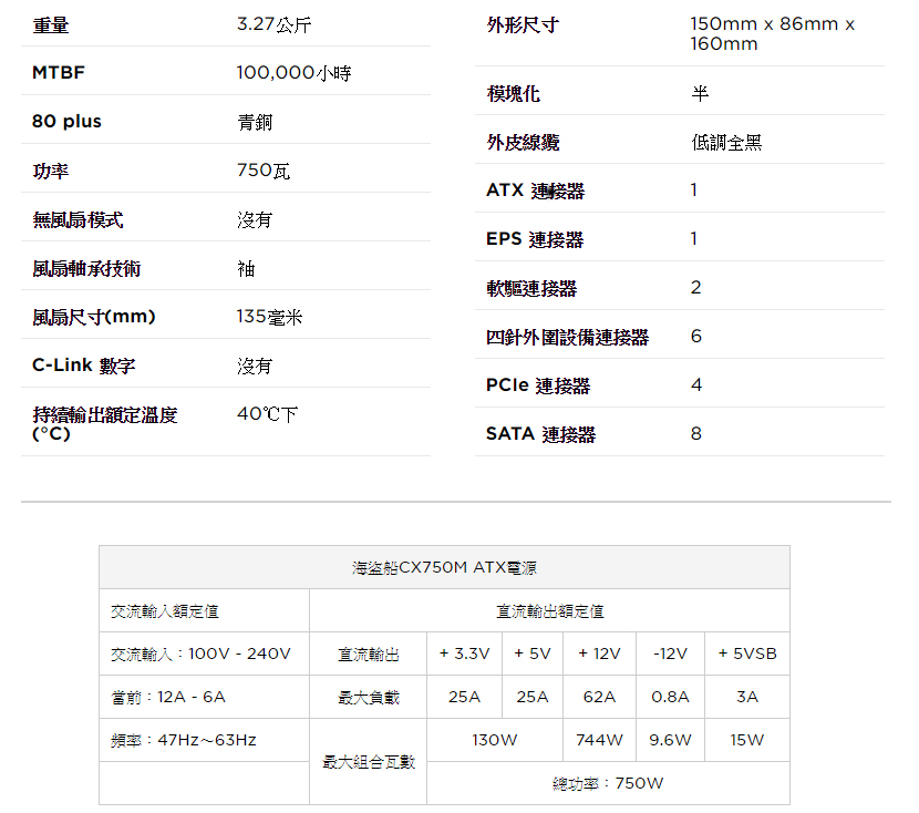 海盜船 CX750M(750W) 銅牌/半模組/五年保固(CP-9020061)