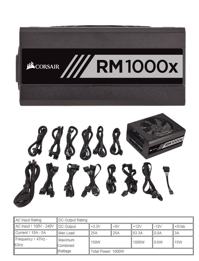 品名:CORSAIR海盜船 RM1000X 80Plus金牌 1000W電源供應器 型號:CMPSU-1000RMX 尺寸:150 x 86 x 160 mm 重量:2.003kg 保固:十年 風扇尺寸:135mm MTBF:100,000 hours 額定交流輸入:100V-240V 輸入電流:13A-6.5A 輸入頻率:47Hz-63Hz 安全認證:FCC、ICES、CE、UL / CUL、CSA、C-Tick/RCM、TUV、CB、CU、KC Mark、RoHS、WEEE、RoHS(中國)、REACH 支援:支持第六代IntelR Core? 處理器(Intel Skylake 和Z170 主板)支持ATX12V v2.4 和EPS 2.92 標準,向下兼容ATX12V 2.2、2.31 和ATX12V 2.01 系統 ※以上規格資訊若有任何錯誤,請以原廠官方網站資料為主