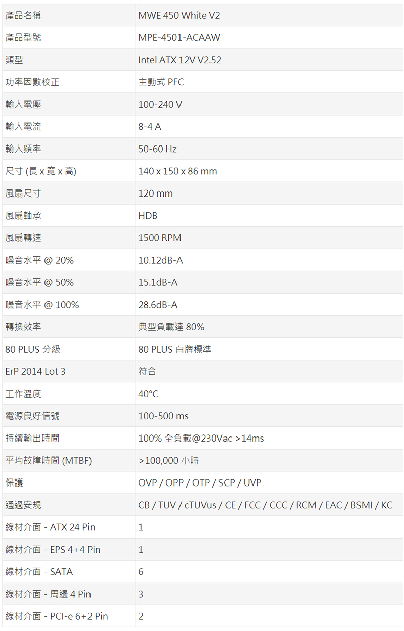 酷碼 MWE WHITE V2 450W/白牌/3年保/CPU主線:18AWG