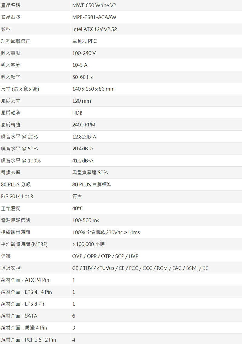酷碼 MWE WHITE V2 650W/白牌/3年保/CPU主線:18AWG