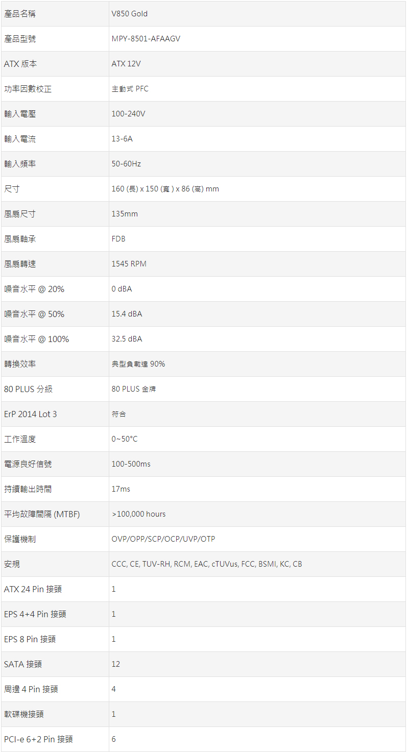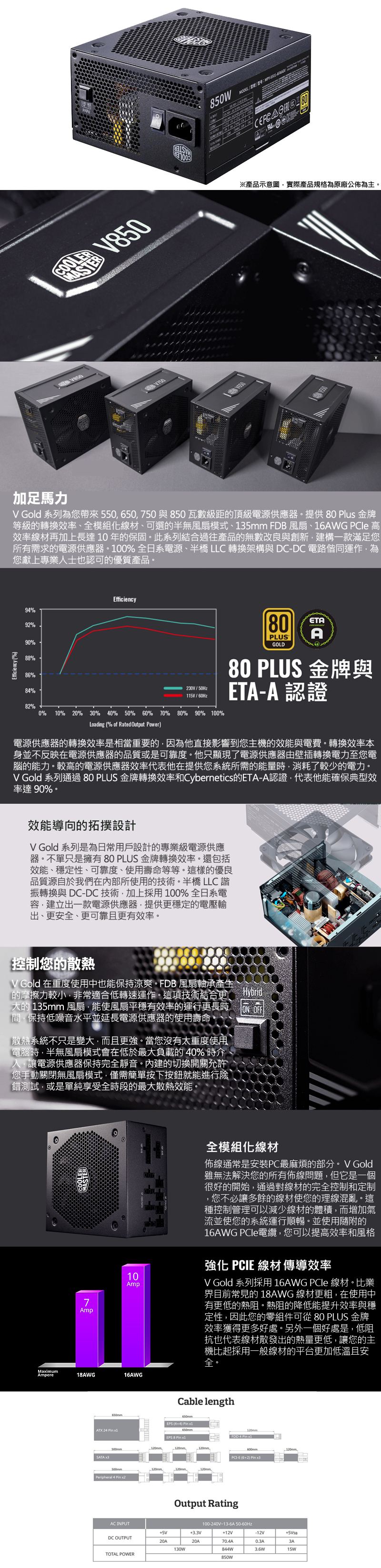 酷碼 V850 GOLD 850W 金牌/全模組/LLC+DC-DC/10年保/CPU主線:18AWG