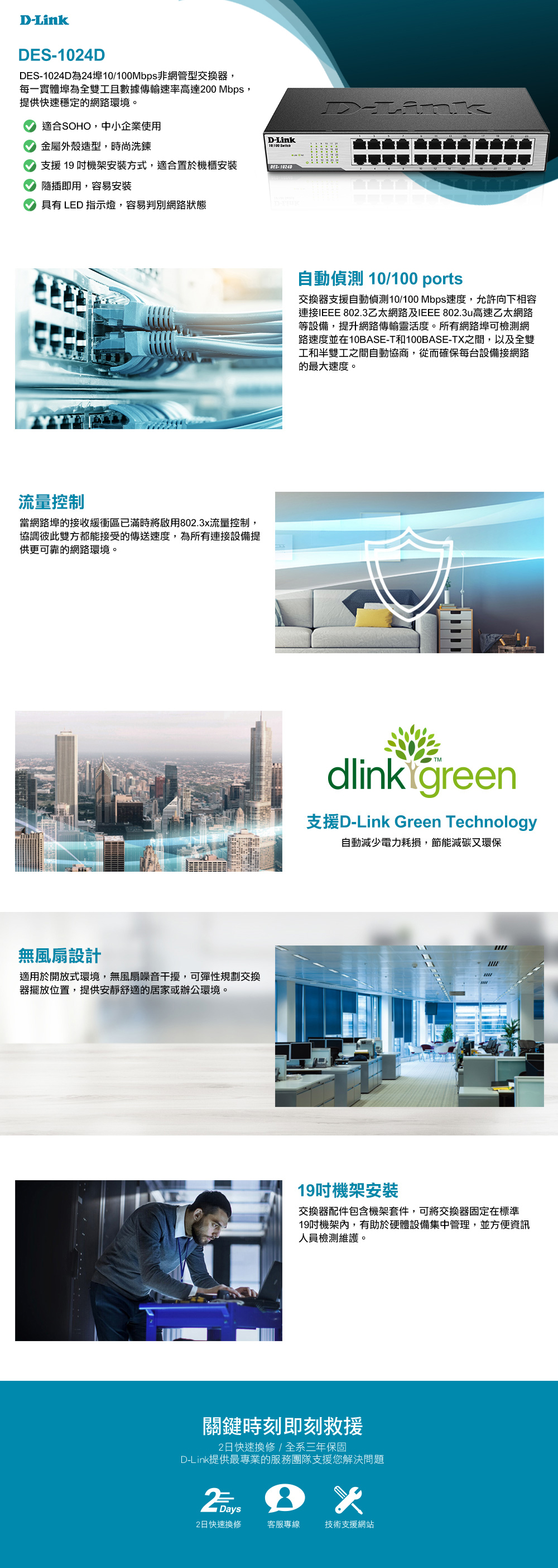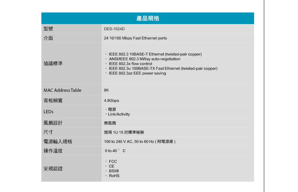 D-Link 友訊 DES-1024D【24埠】Gigabit交換器/金屬殼/10-100M/三年換新