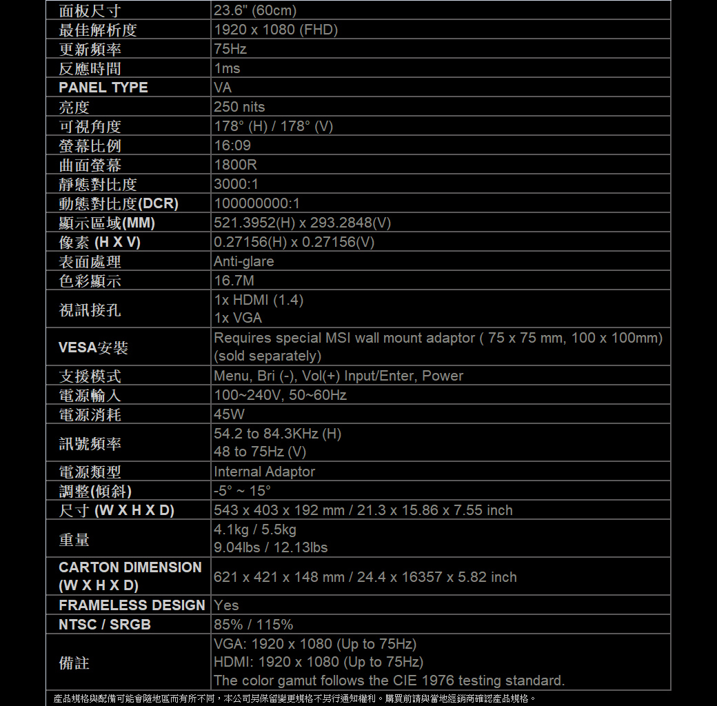 MSI Optix G241VC(1H1A/1ms/VA/無喇叭/FreeSync)