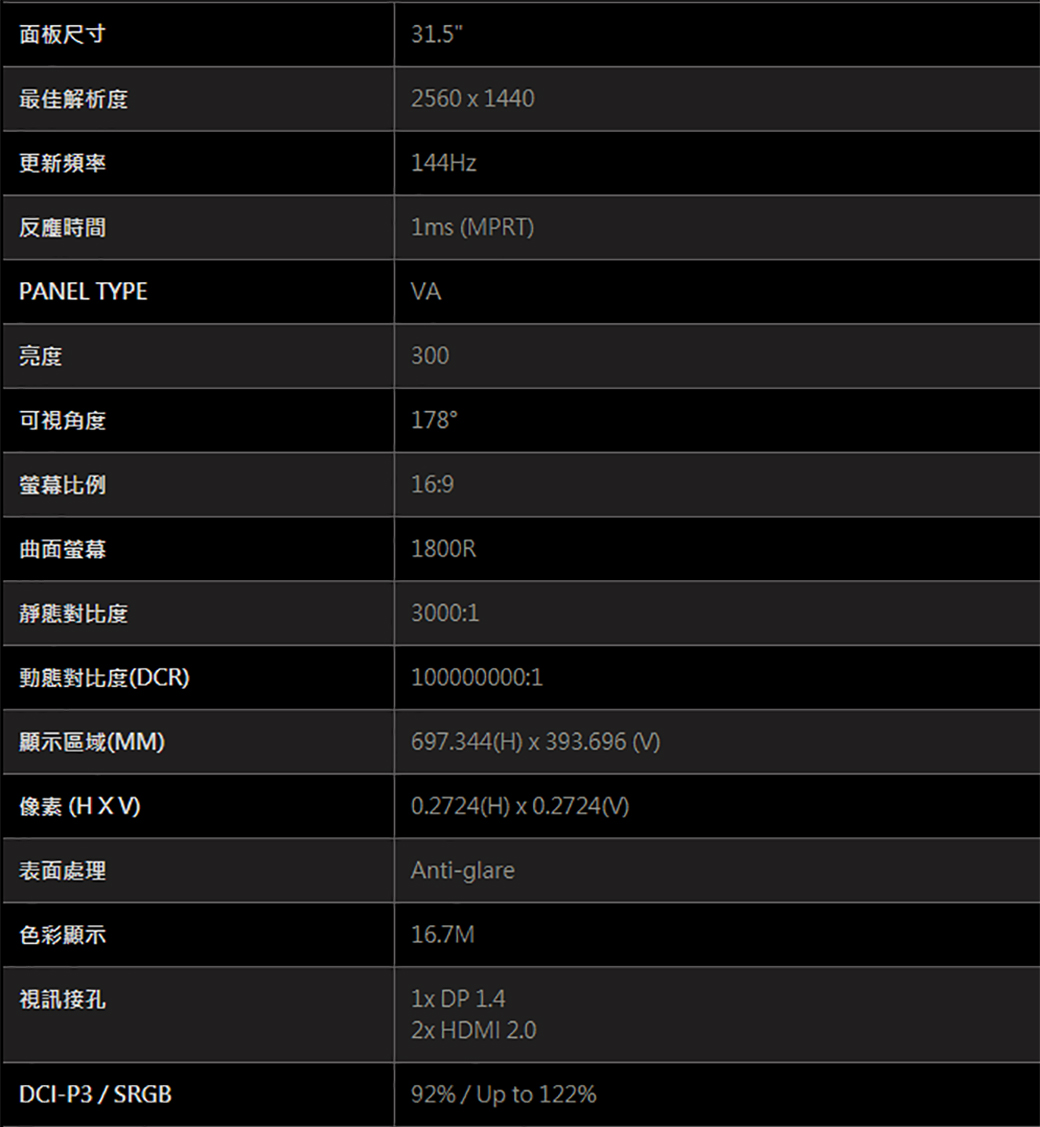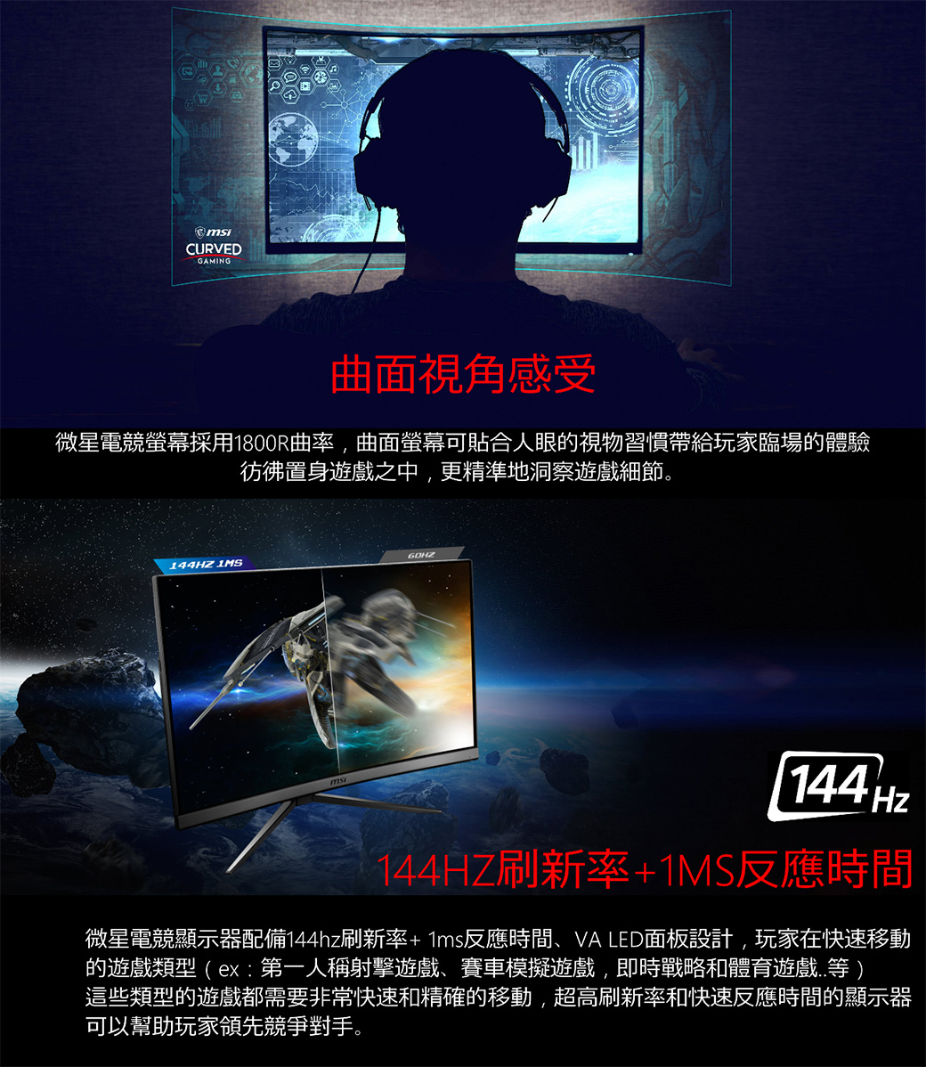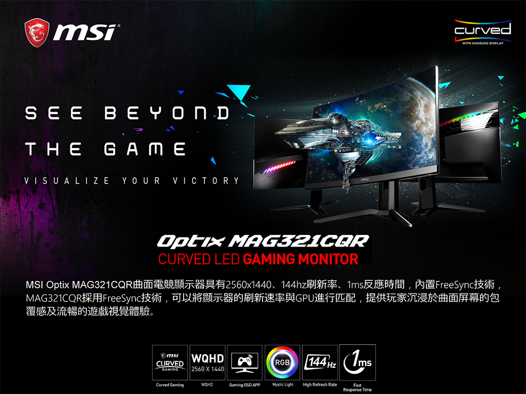 MSI MAG321CQR(2H1P/1ms/VA曲面/144Hz/無喇叭/FreeSync)RGB燈光.廣色域電競螢幕