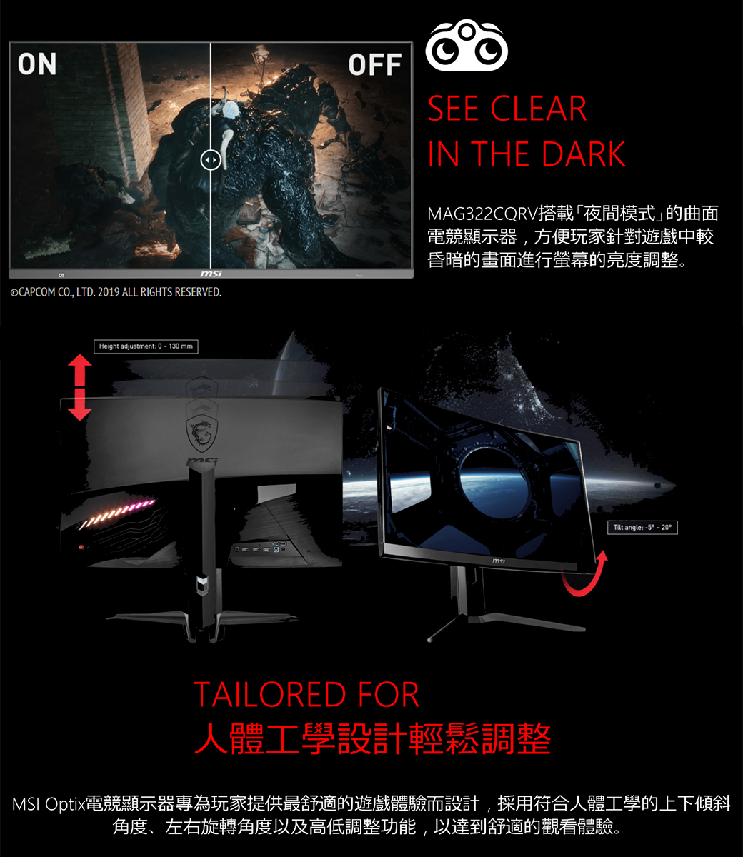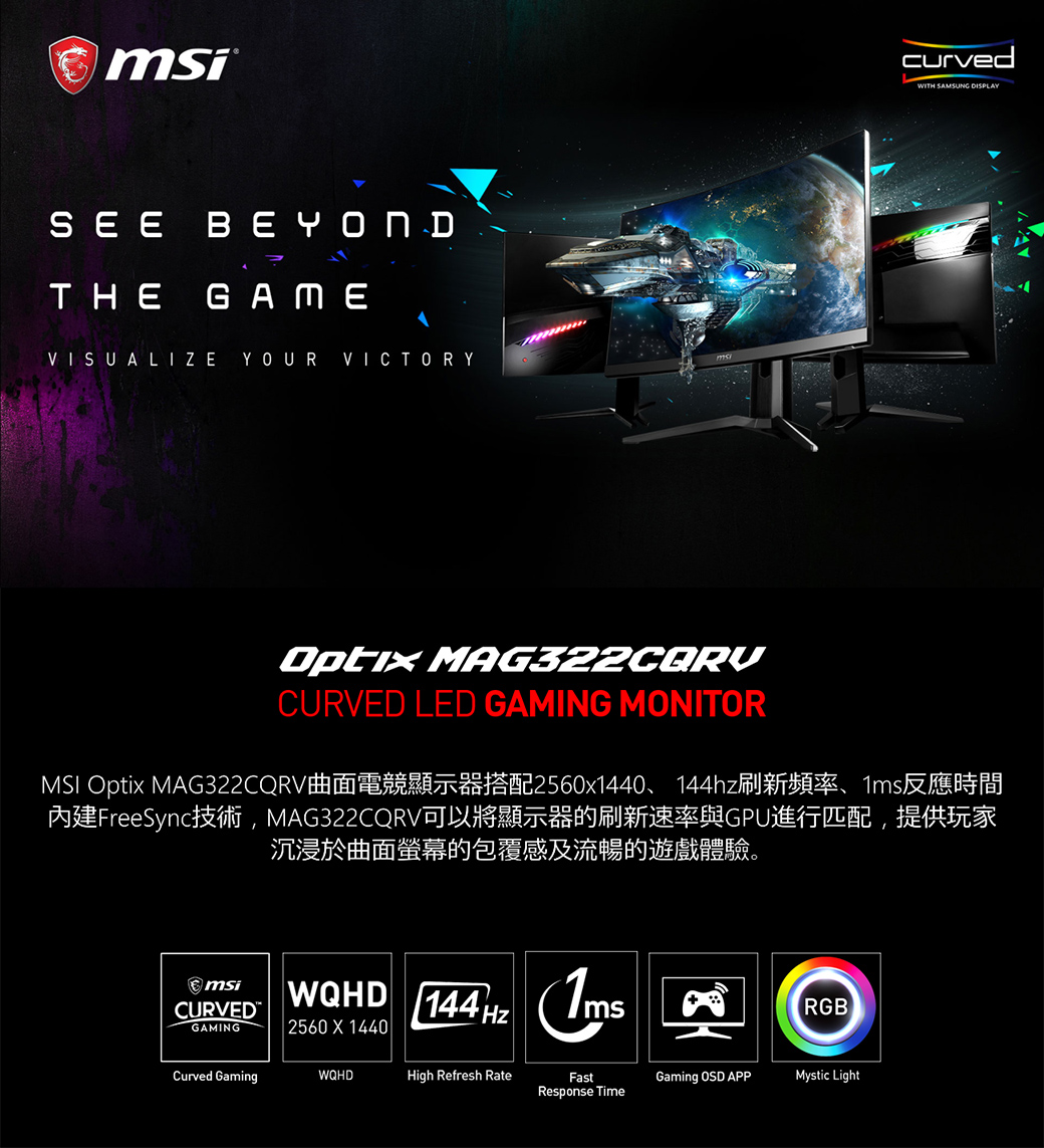 MSI MAG322CQRV(2H1P/1ms/VA曲面/144Hz/無喇叭/FreeSync)RGB電競螢幕