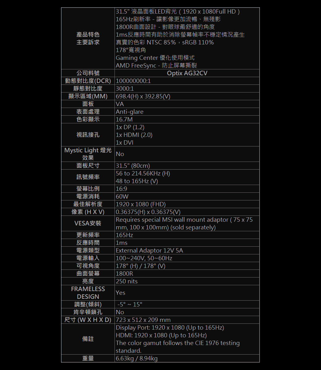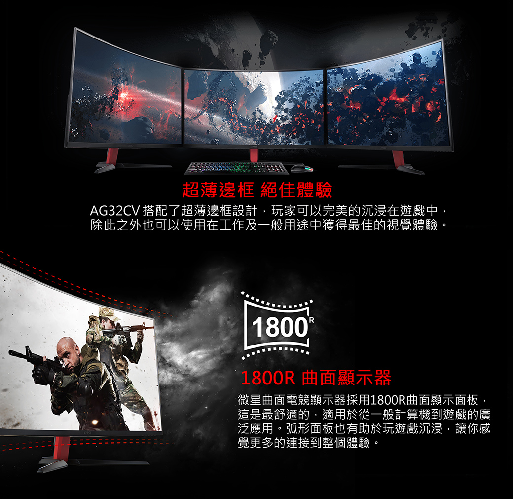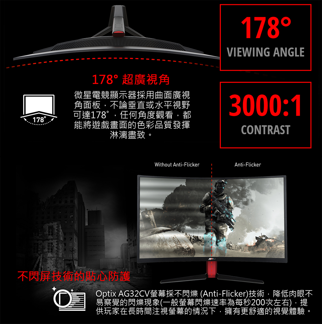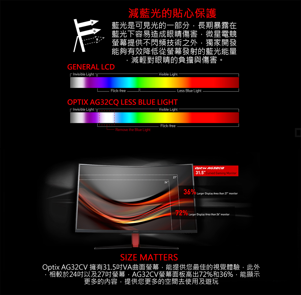MSI AG32CV(1D1H1P/1ms/VA曲面/165Hz/無喇叭/FreeSync)不閃.低藍