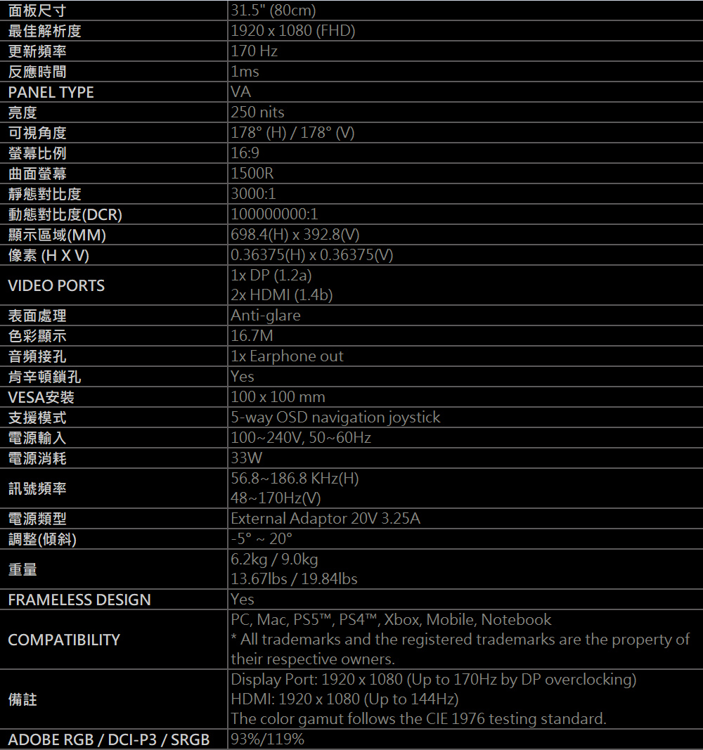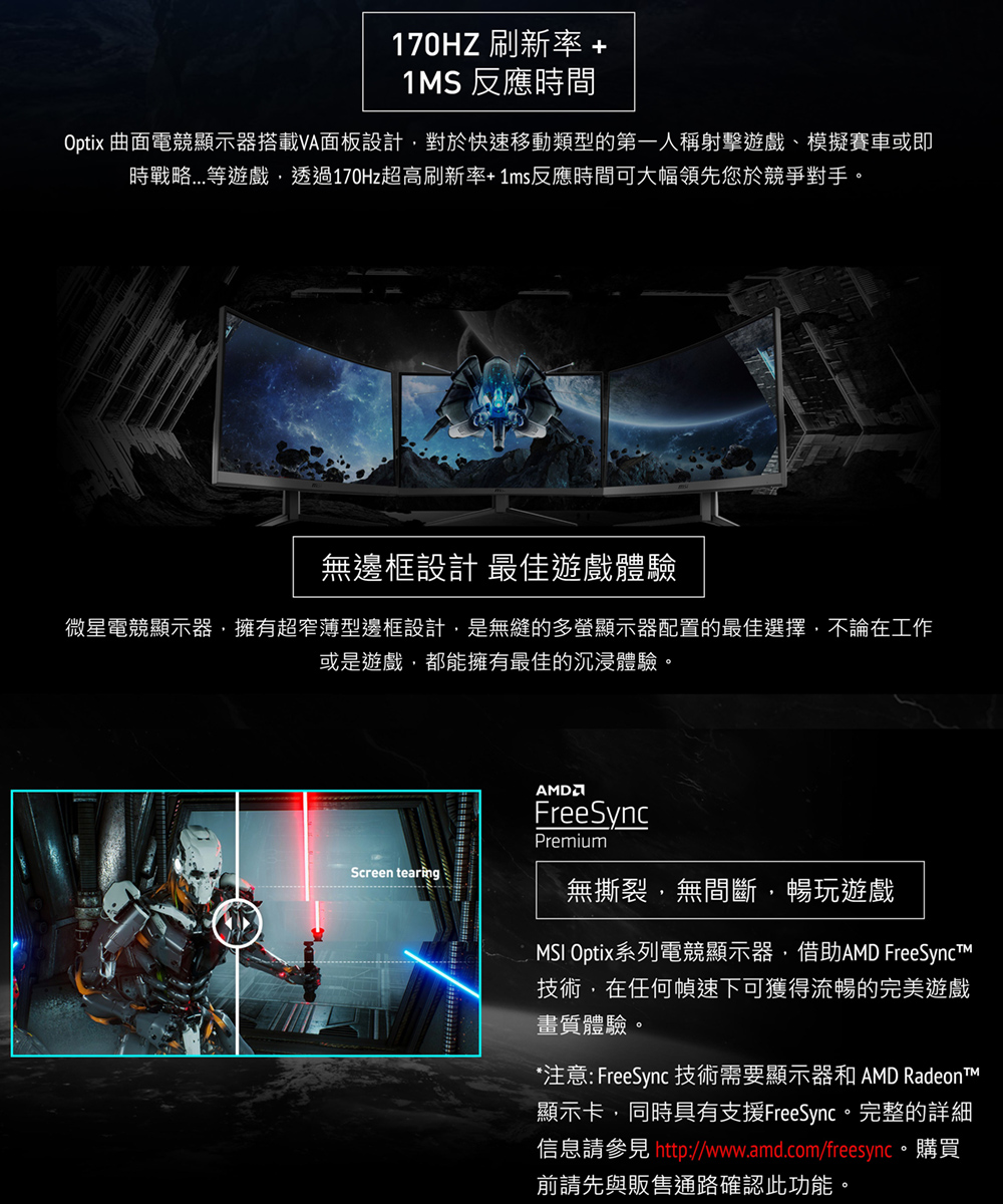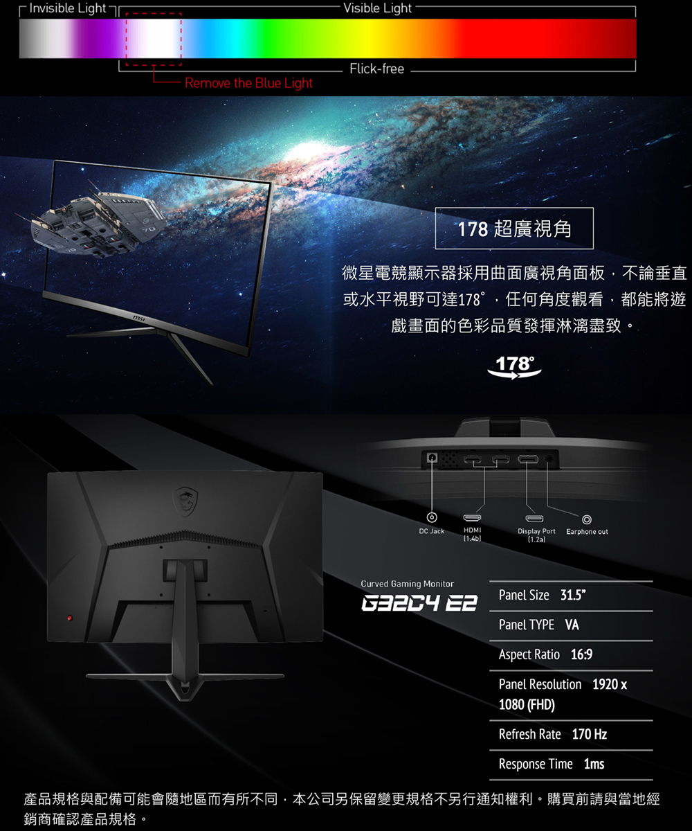 MSI Optix G32C4 E2(2H1P/1ms/VA曲面/170Hz/無喇叭/FreeSync)廣色域電競螢幕