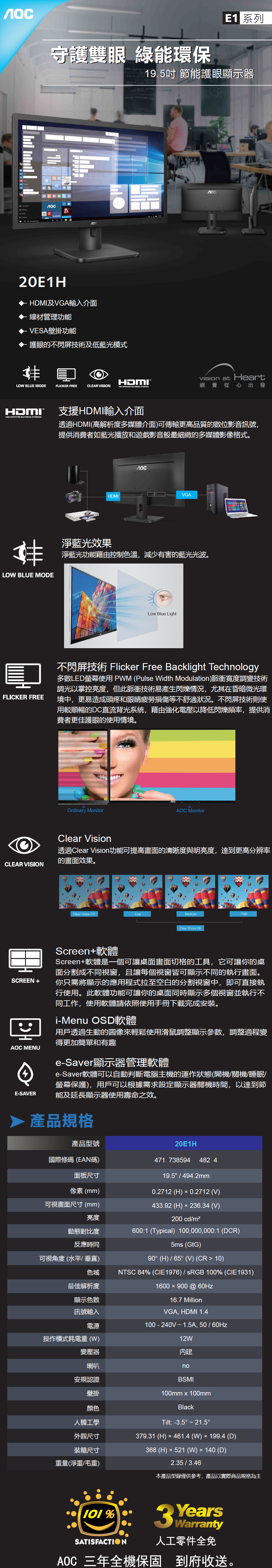 AOC 20E1H(1A1H/5ms/TN/無喇叭/1600*900 16:9)