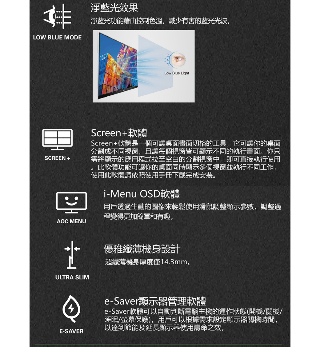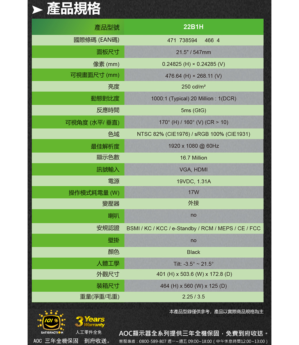 AOC 22B1H(1A1H/5ms/TN/無喇叭) 超纖薄.淨藍光.不閃屏
