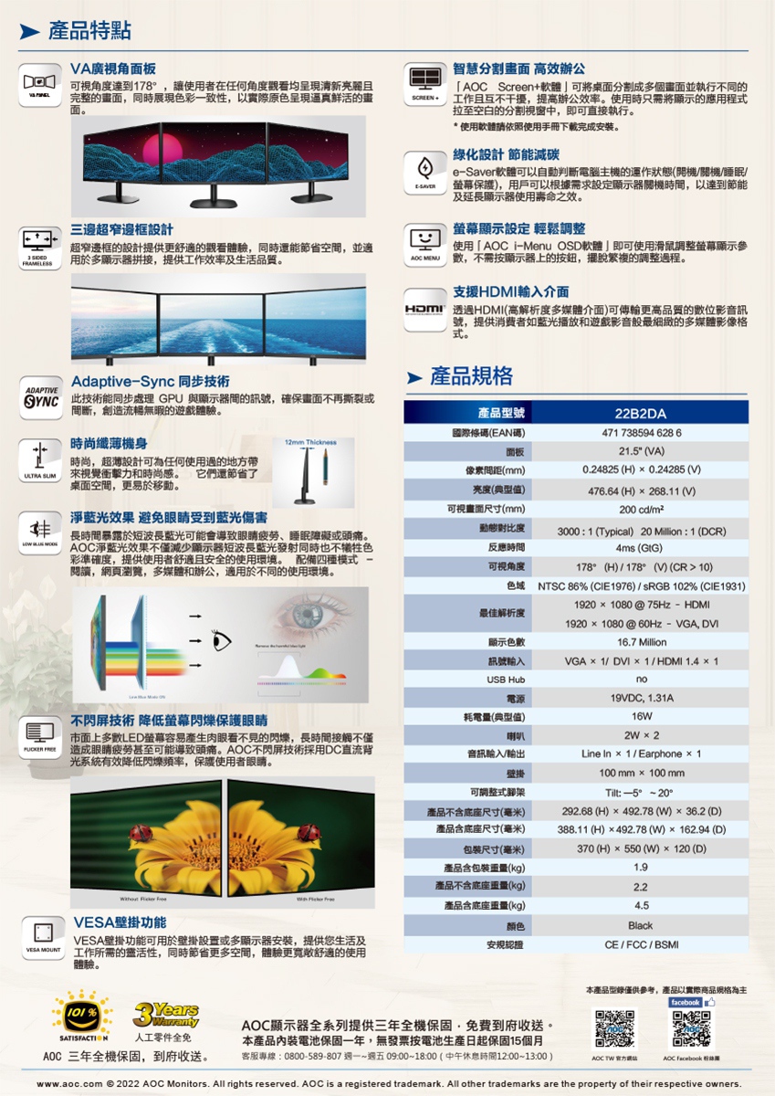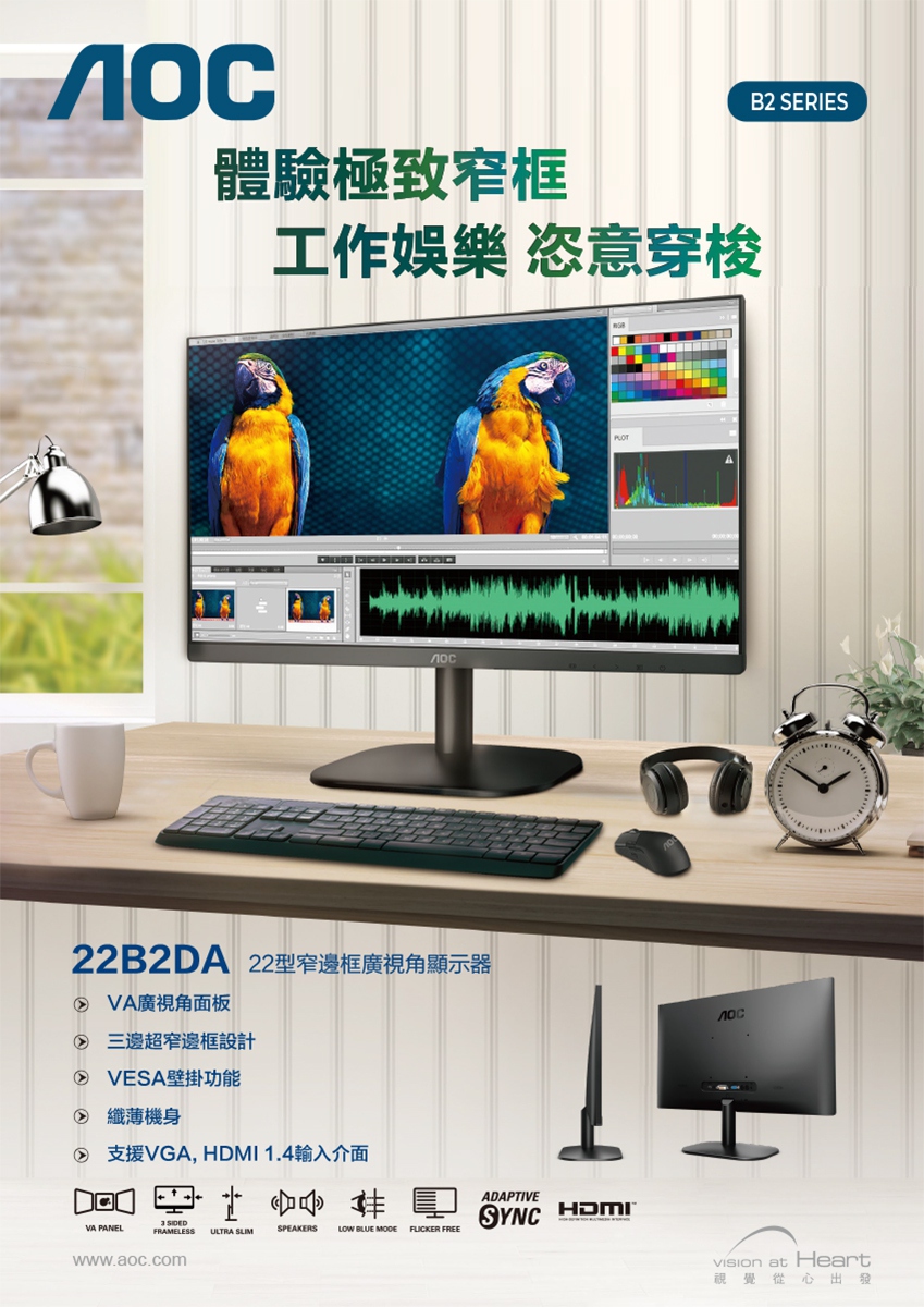 AOC 22B2DA(1A1D1H/4ms/VA/含喇叭)窄邊框廣視角顯示器