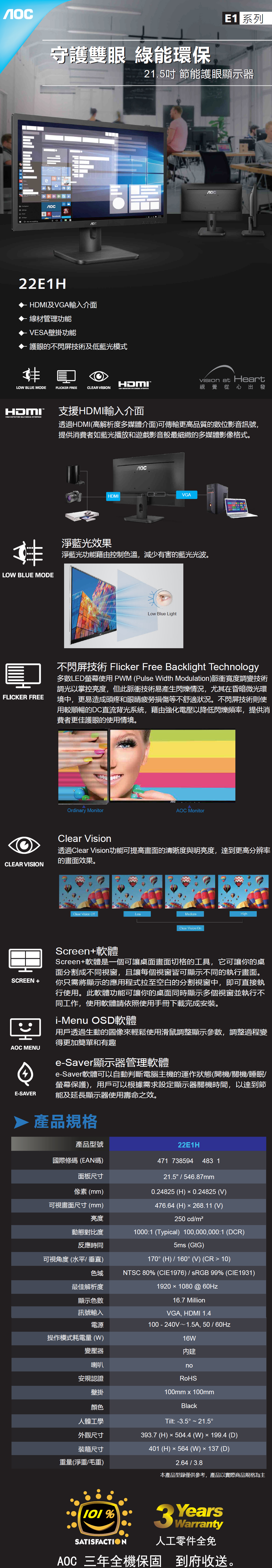 AOC 22E1H(1A1H/5ms/TN/無喇叭)【下標前請先詢問 尾盤】