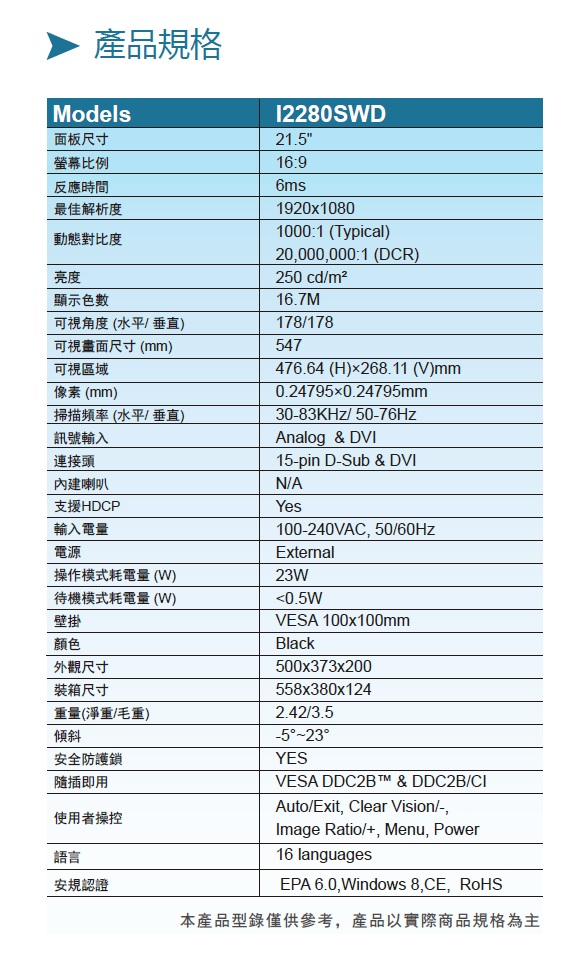 AOC i2280SWD(1A1D/2千萬/6ms/IPS/無喇叭)不閃屏
