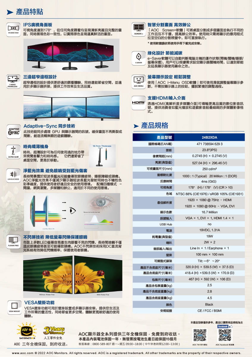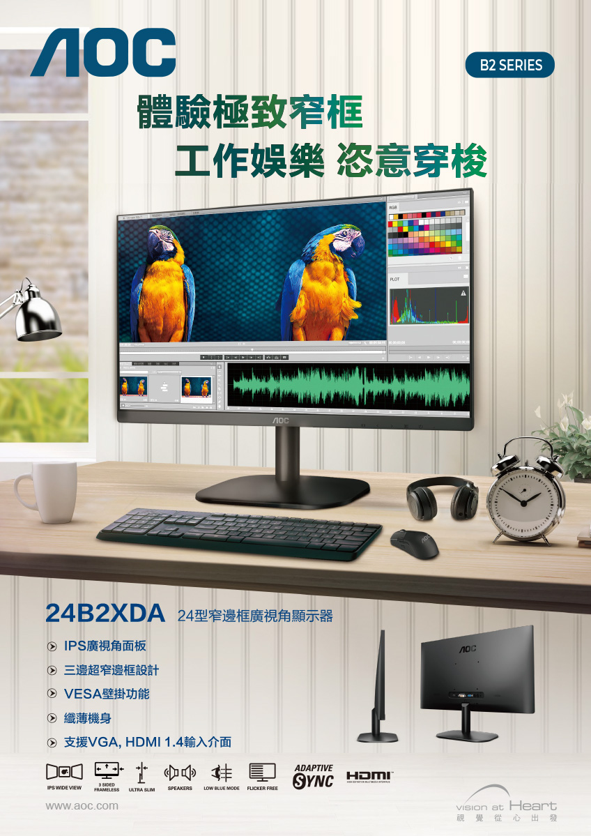 AOC 24B2XDA(1A1D1H/4ms/IPS/含喇叭)窄邊框.不閃頻.低藍光