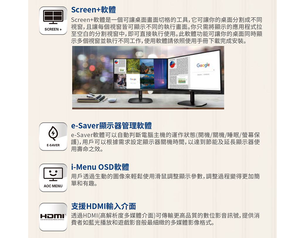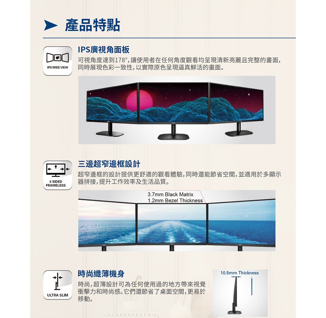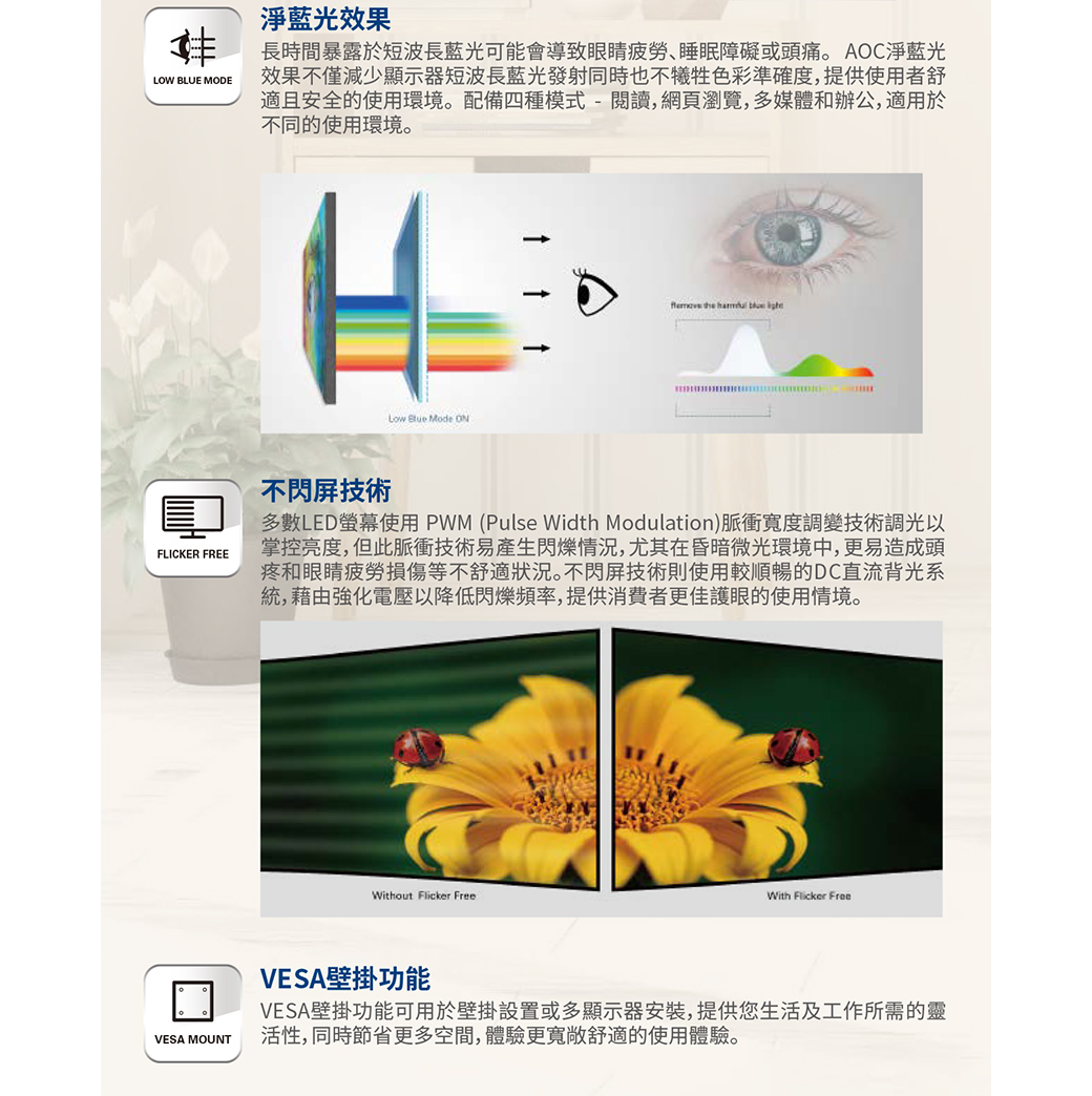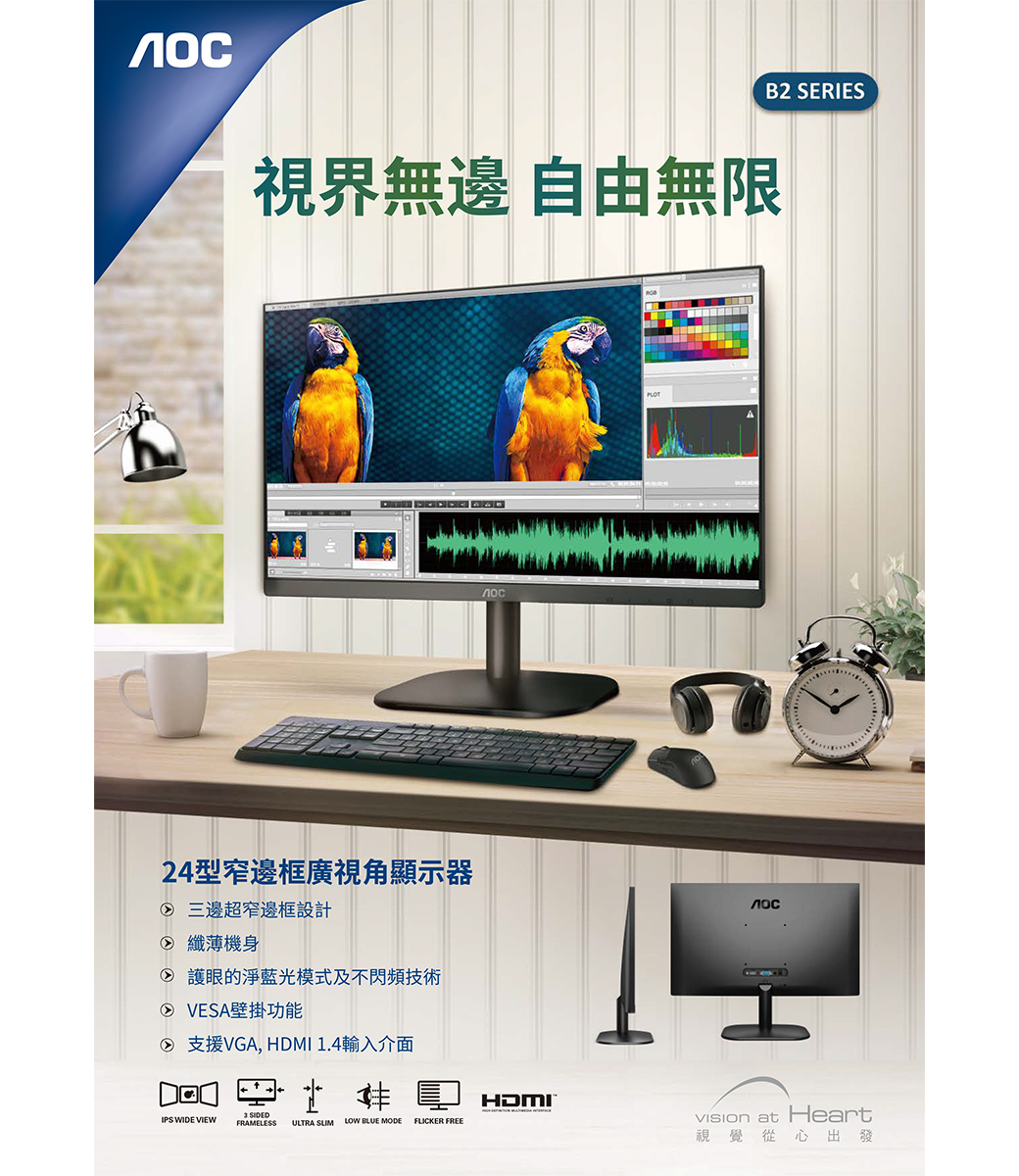 AOC 24B2XH(1A1H/8ms/IPS/無喇叭)三邊無邊框設計.低藍光不閃屏