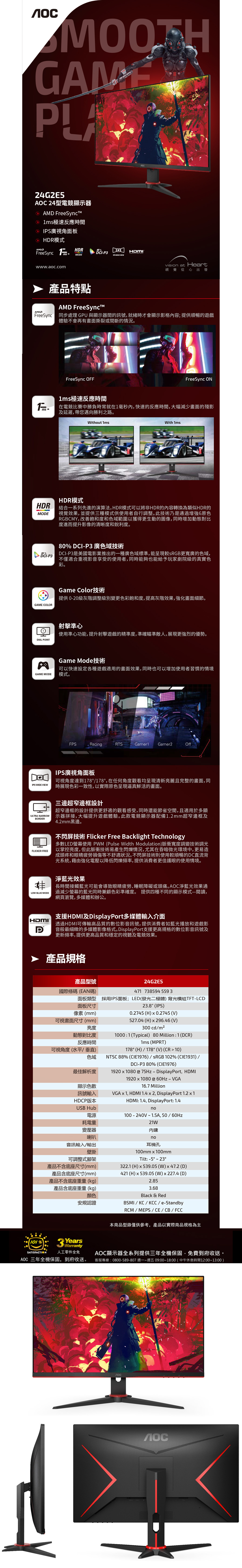 AOC 24G2E5(1A2H1P/1ms/IPS/75Hz/無喇叭/FreeSync) 電競遊戲顯示器