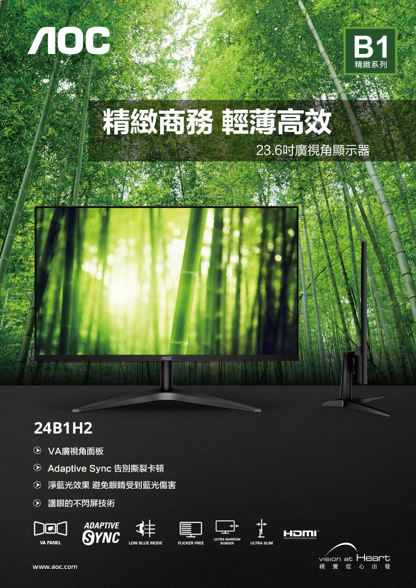 AOC 24B1H2(1A1H/8ms/VA/無喇叭/Adaptive Sync)輕薄.低藍光