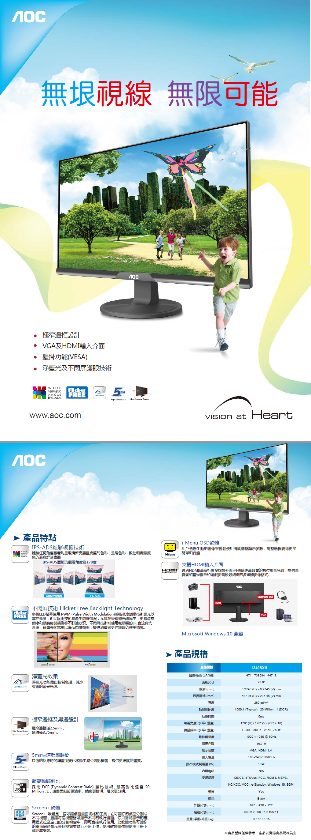 AOC I240SXH(1A1H/5ms/IPS-ADS/無喇叭)極窄邊框.不閃頻
