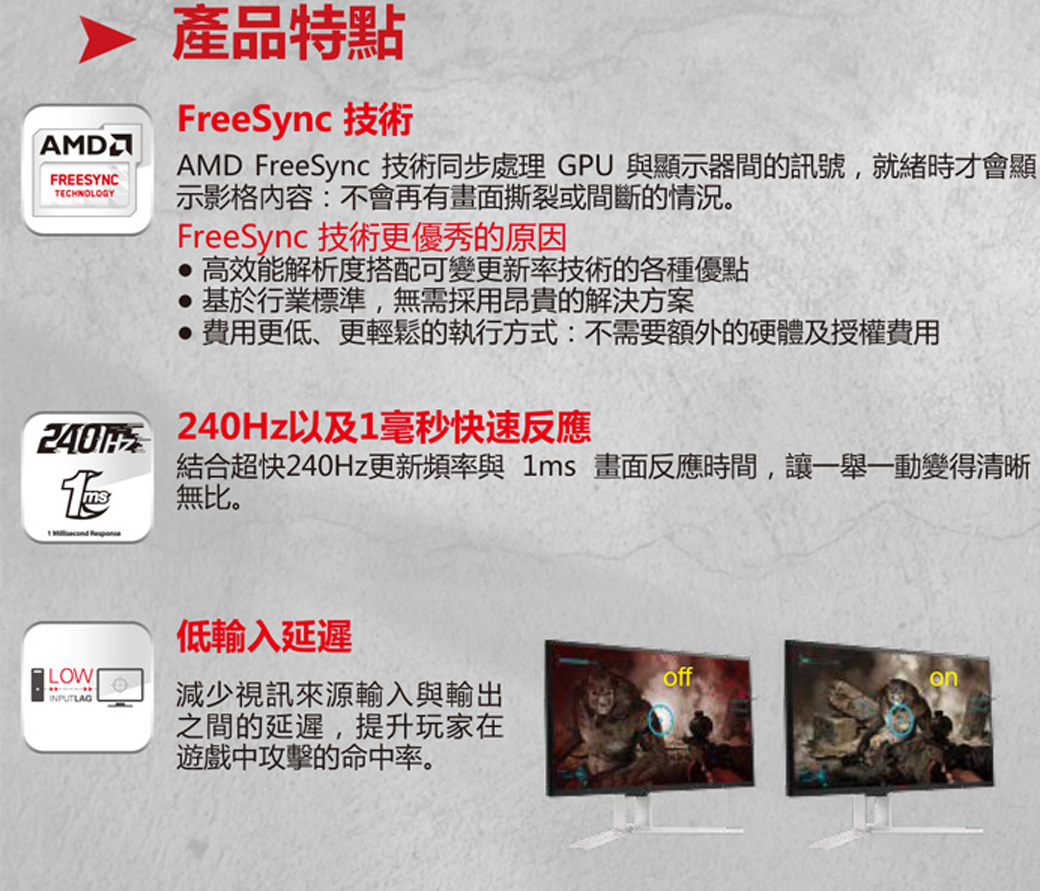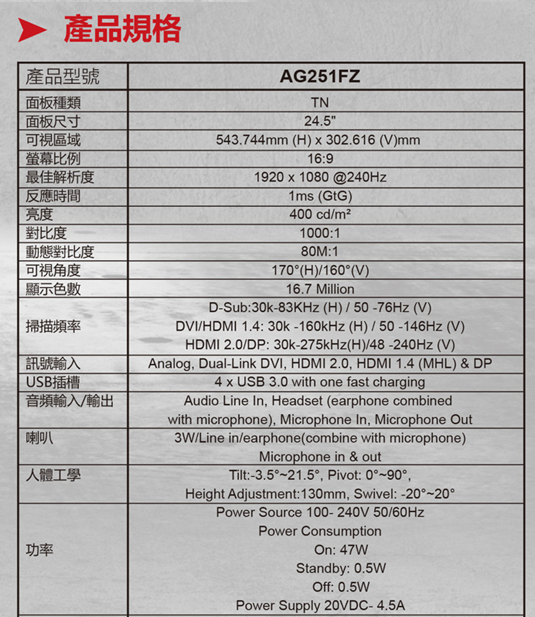 AOC AGON AG251FZ(1A1D2H1P/1000/1ms/TN/240Hz/含喇叭)Free-Sync電競機