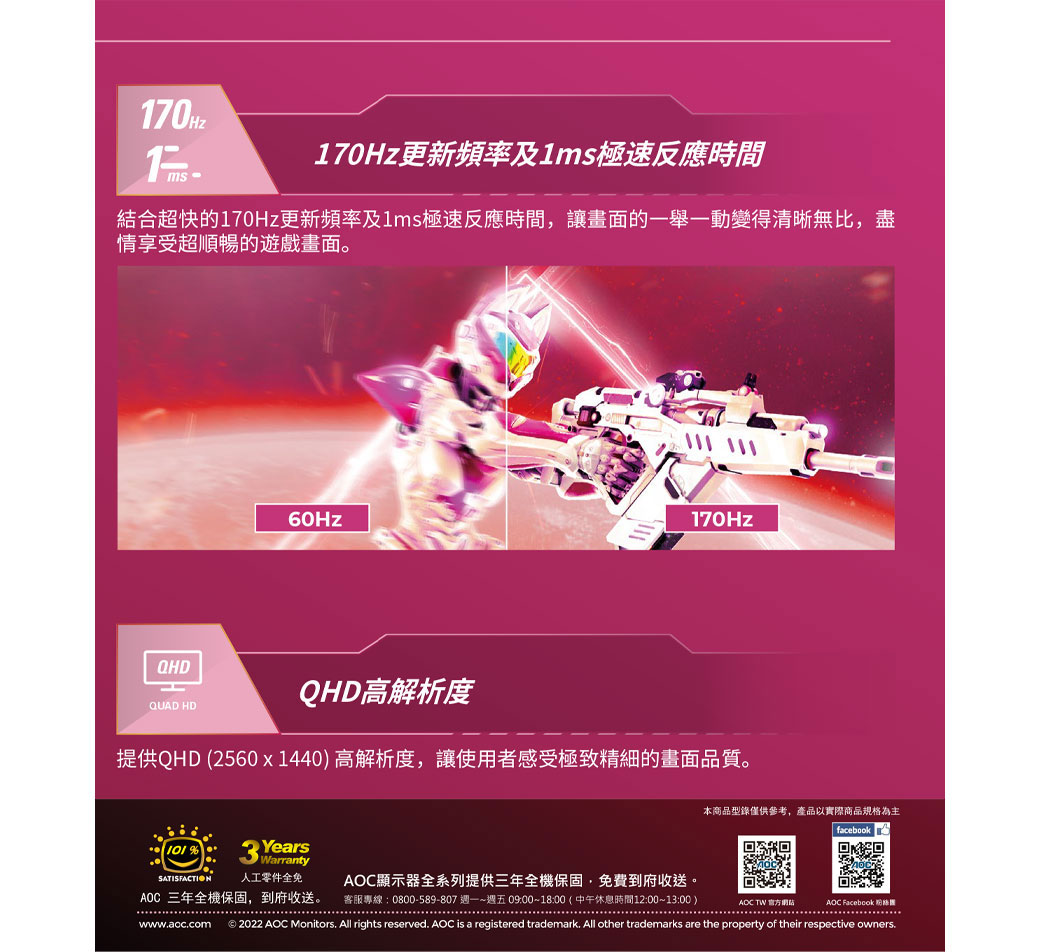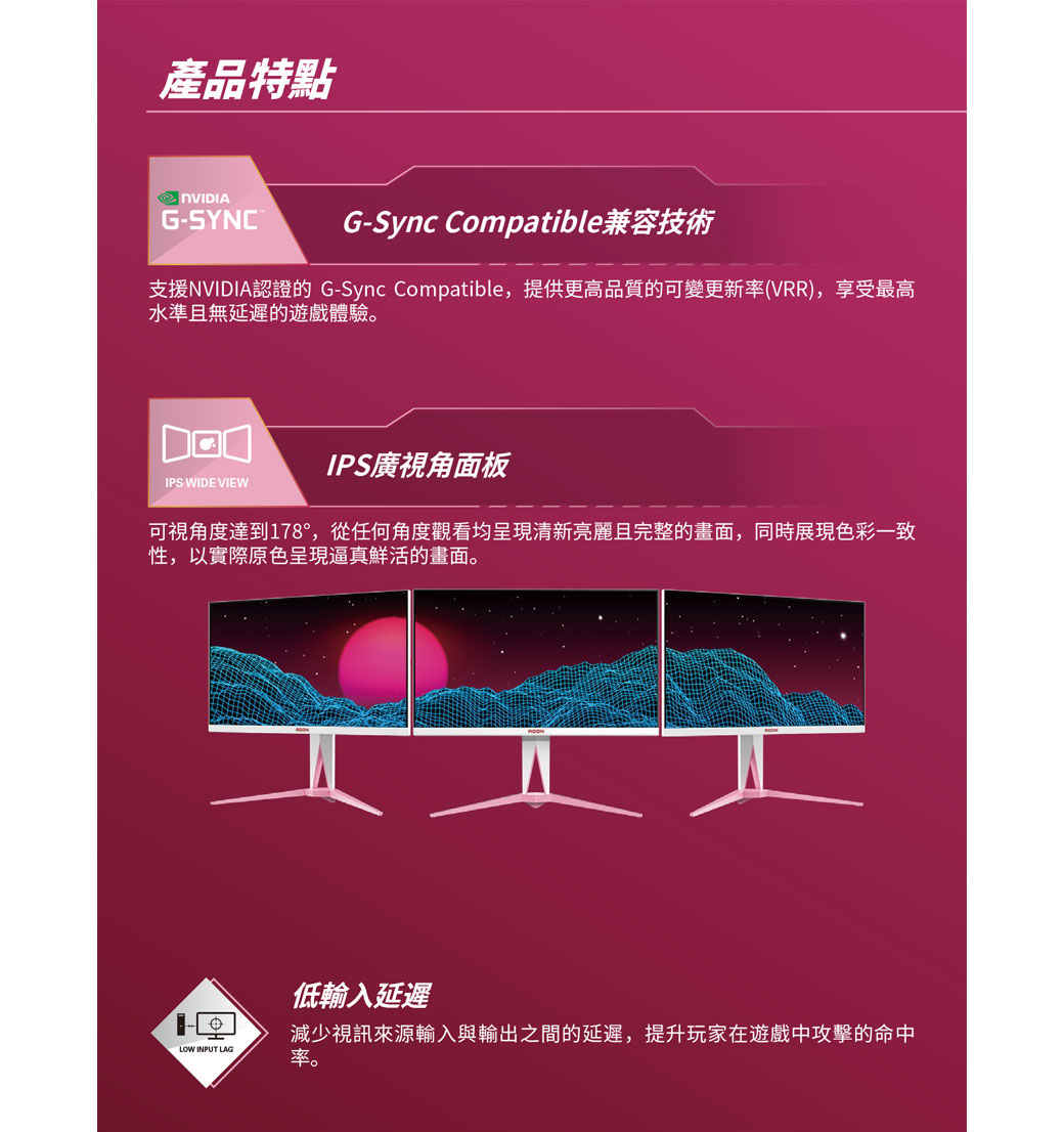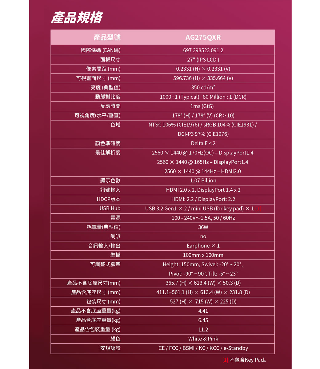 AOC AG275QXR(2H2P/1ms/IPS/170Hz/無喇叭/G-Sync兼容) 粉紅