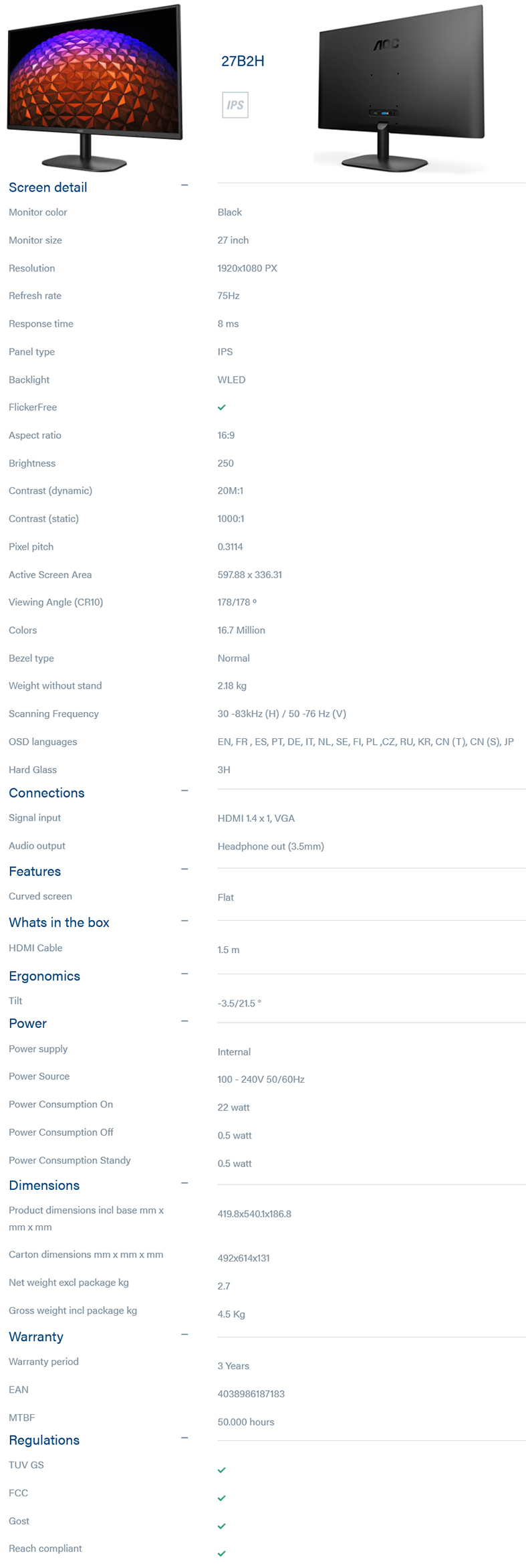 AOC 27B2H(1A1H/8ms/IPS/75Hz/無喇叭) 三邊窄邊框設計.低藍光不閃屏