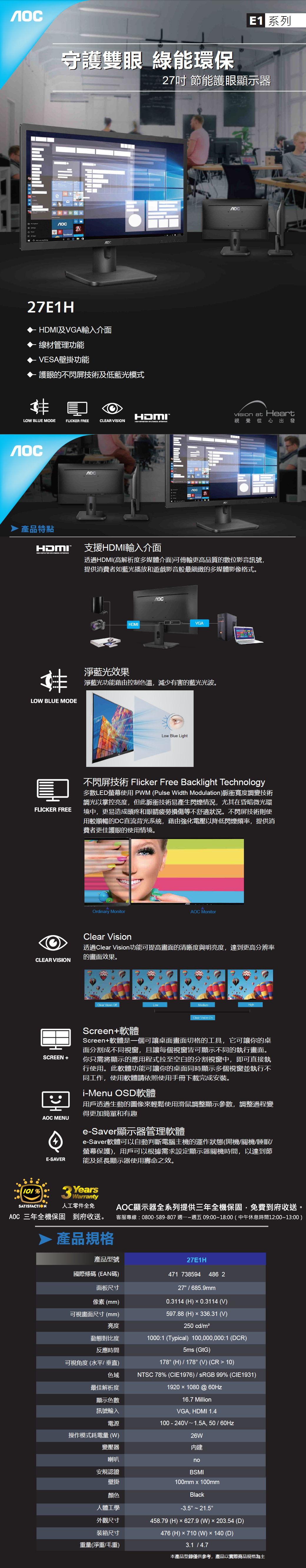 AOC 27E1H(1A1H/5ms/IPS/無喇叭)淨藍光.不閃頻