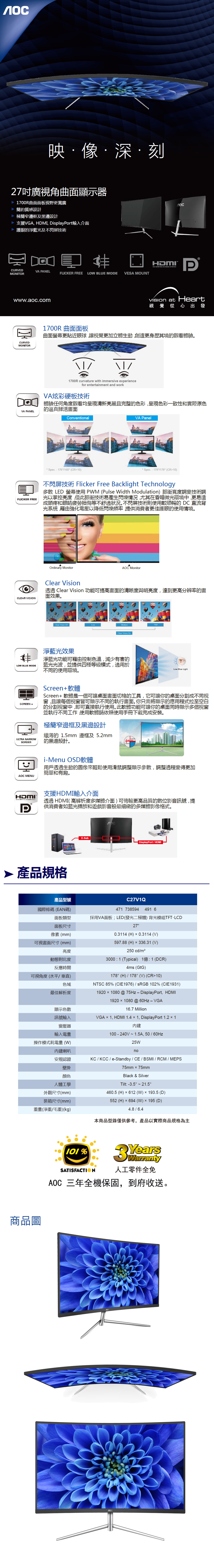 AOC C27V1Q(1A1H1P/4ms/VA曲面/無喇叭)極簡窄邊框設計.低藍光不閃屏