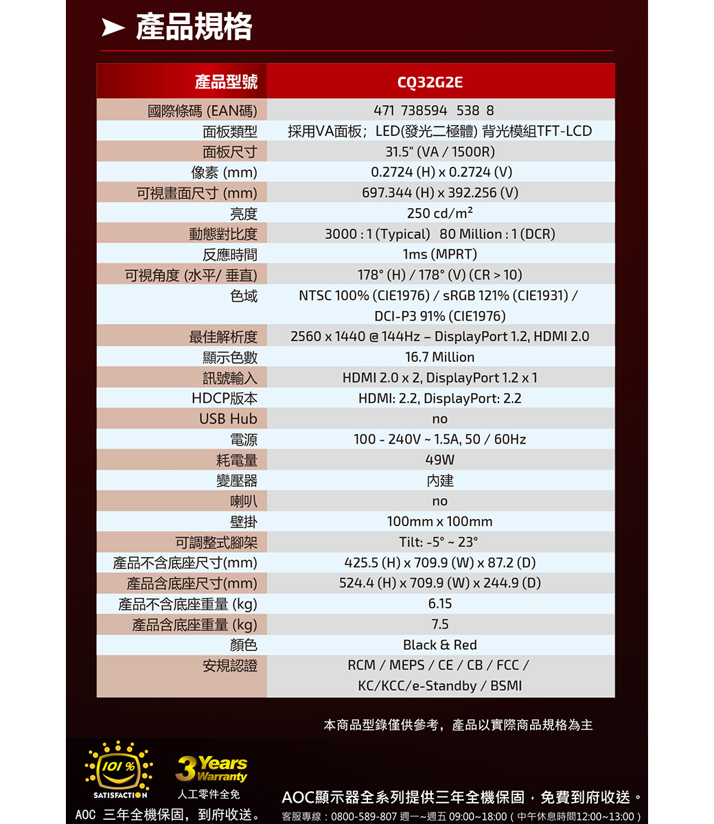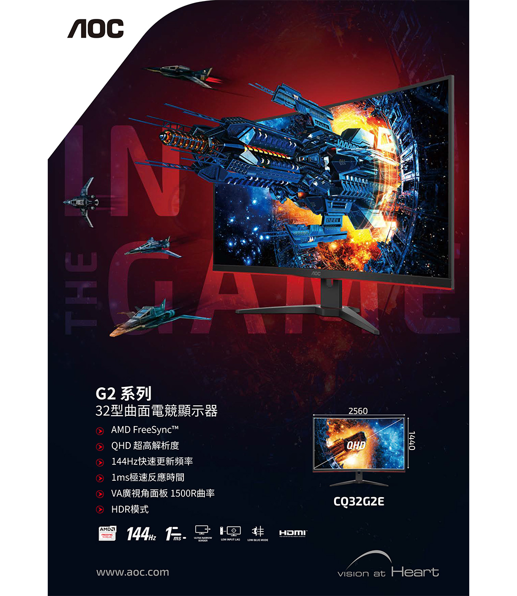 AOC C32G2E(1A1H1P/1ms/VA曲面/165Hz/無喇叭/FreeSync/HDR)