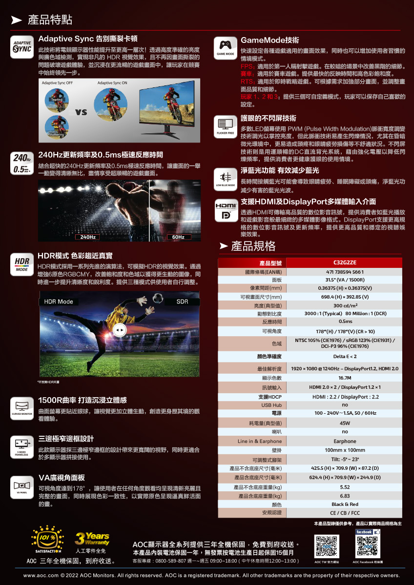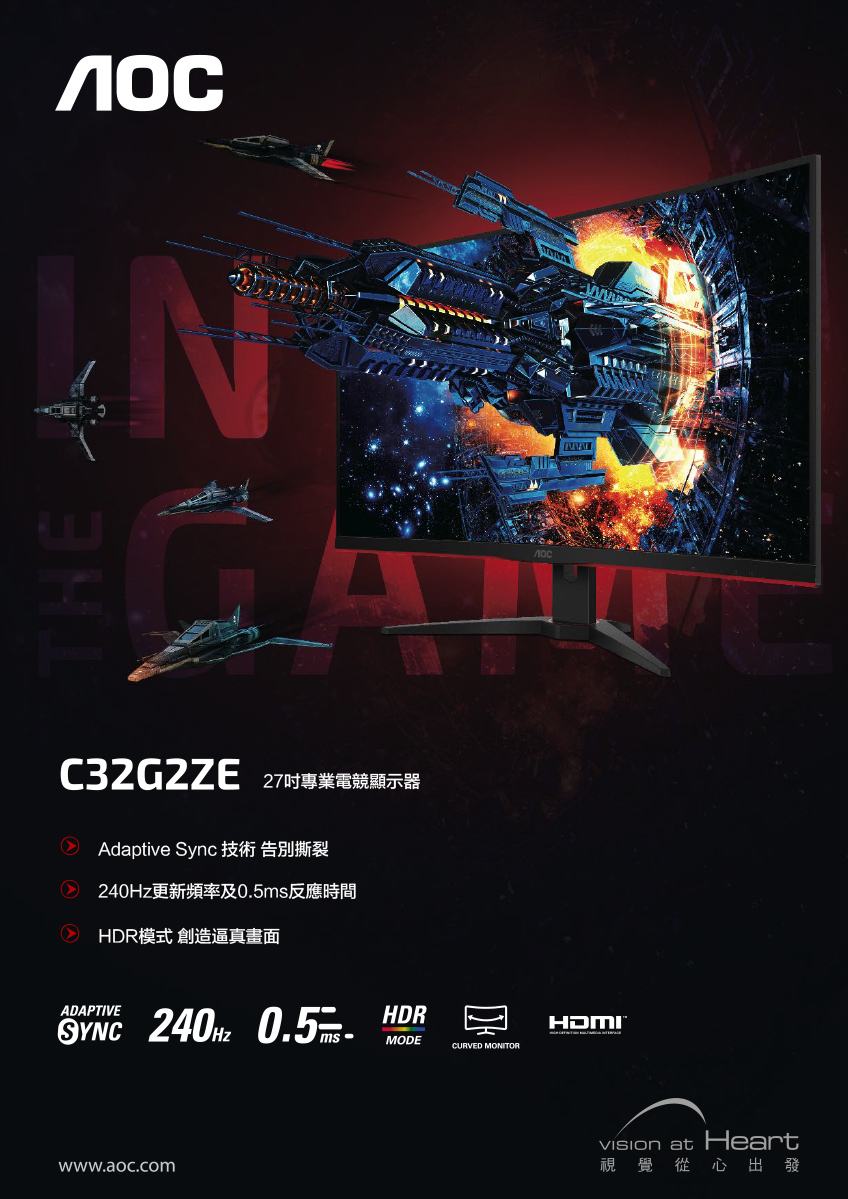 AOC C32G2ZE(2H1P/0.5ms/VA曲面/240Hz/無喇叭/Freesync Premium)電競螢幕