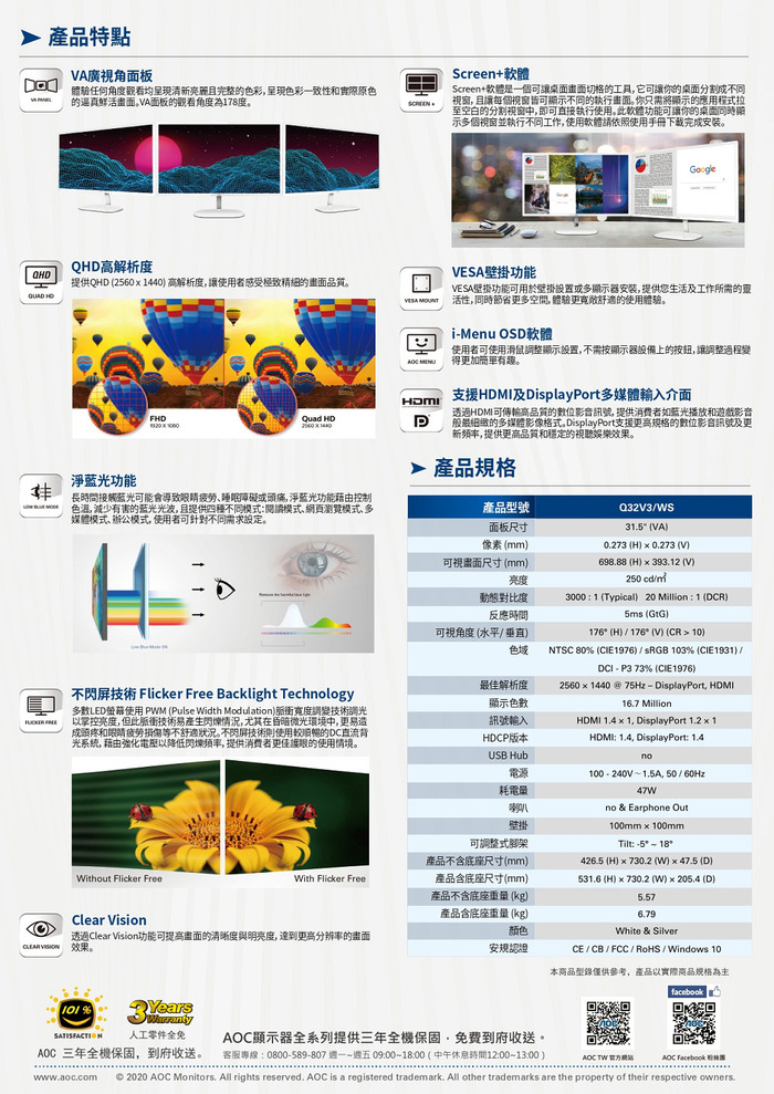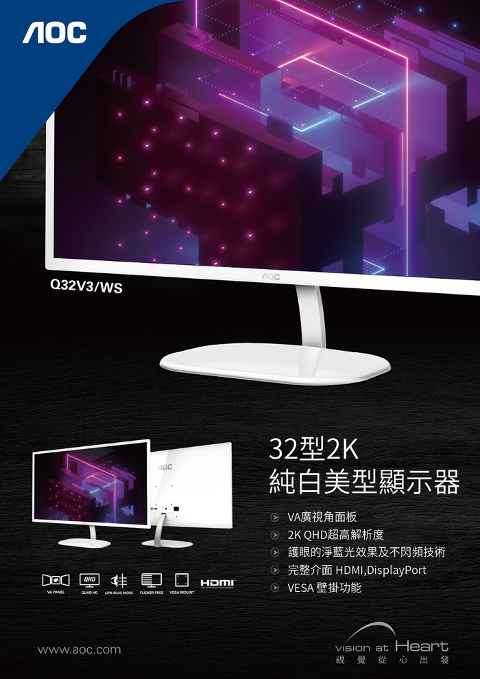AOC Q32V3(1H1P/5ms/VA/75Hz/無喇叭)淨藍光.無閃爍.純白美型顯示