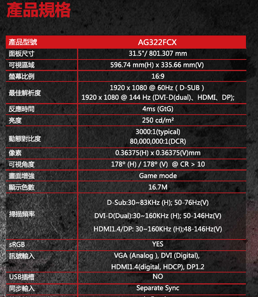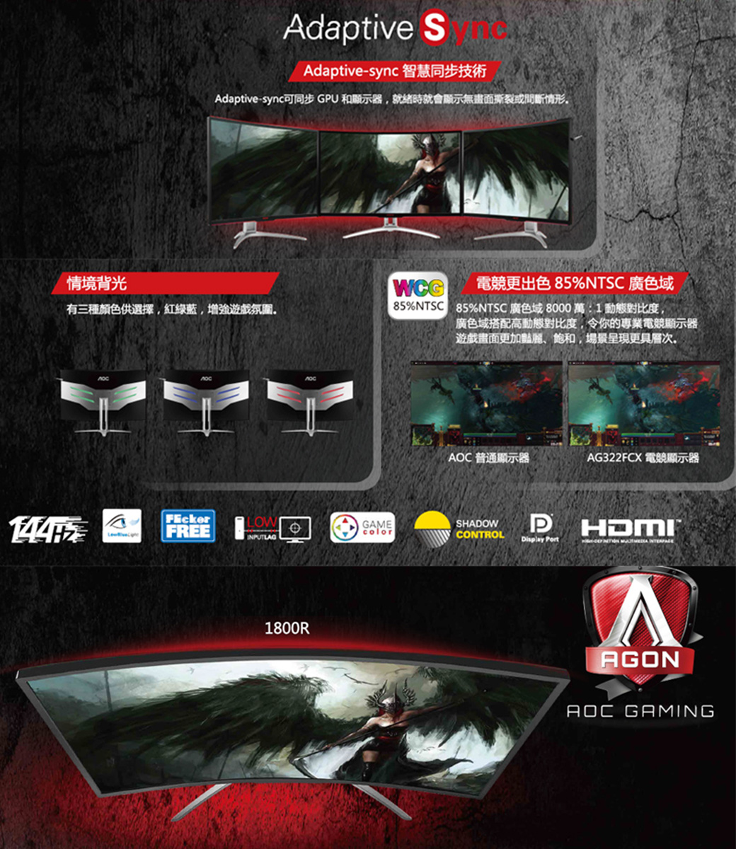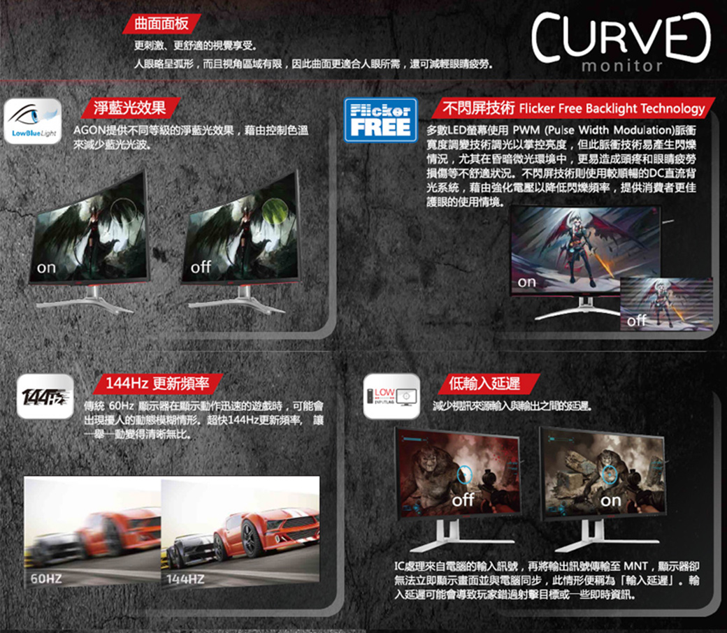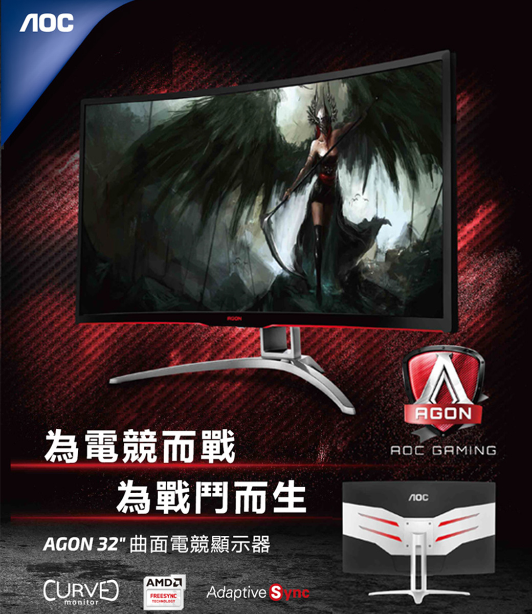 AOC AGON AG322FCX(1A1D1H1P/8千萬/5ms/VA曲面/144Hz/無喇叭)
