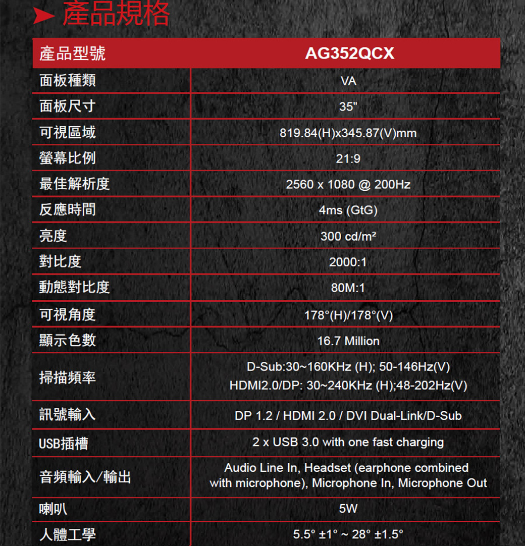 AOC AGON AG352QCX(1A1H1D1P/4ms/VA曲面/200Hz/含喇叭)*FreeSync