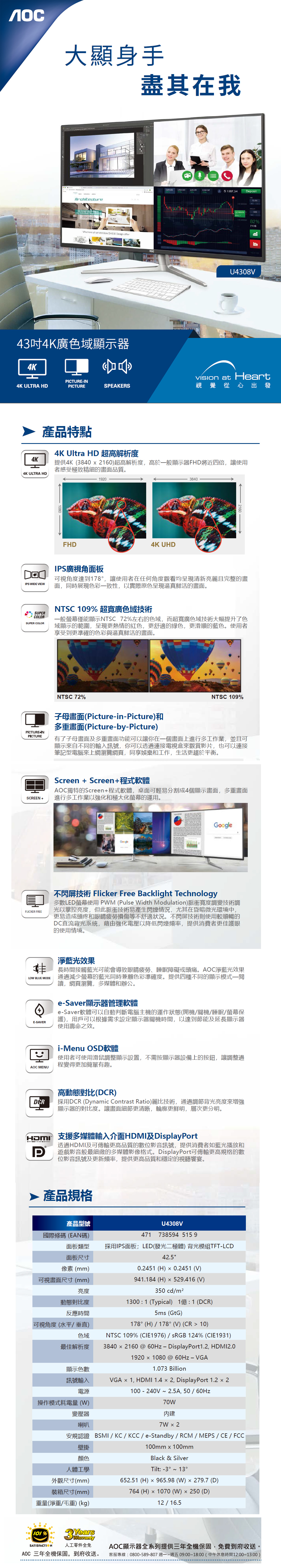 AOC U4308V(1A2H1P1MP/5ms/IPS/含喇叭) 廣色域.不閃屏.淨藍光