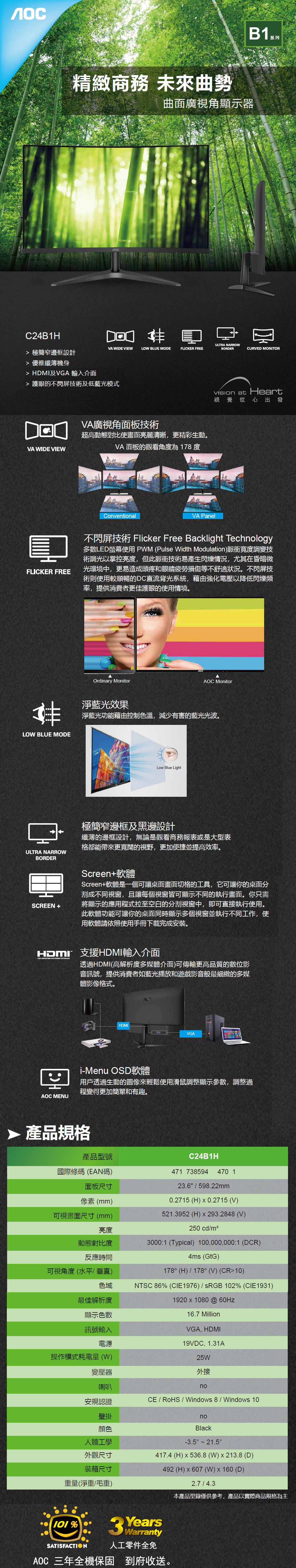 AOC C24B1H(1A1H/4ms/VA曲面/無喇叭)極簡窄邊框設計.低藍光不閃屏