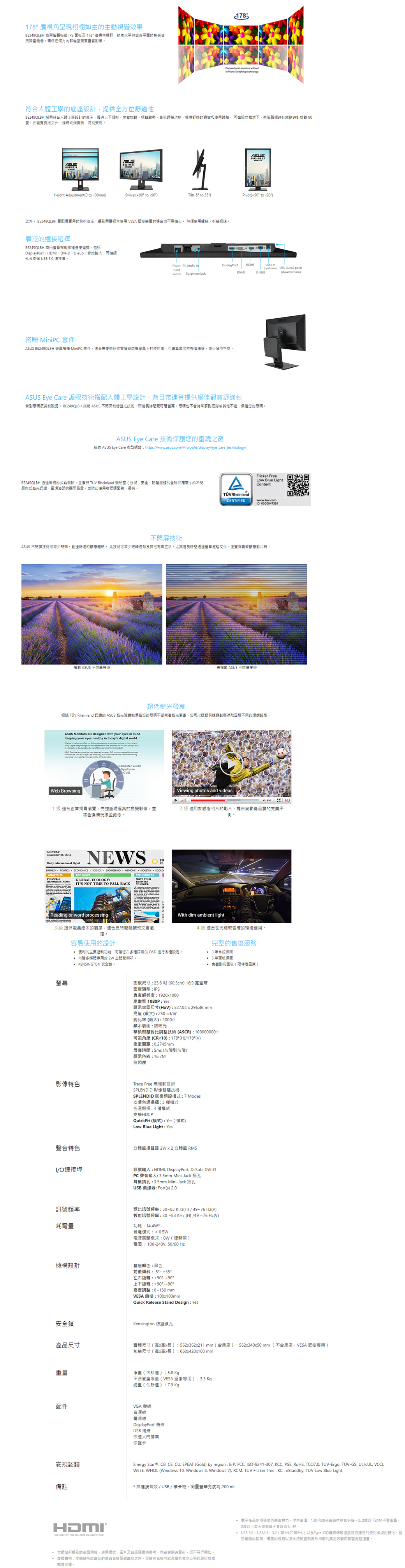 華碩 BE249QLBH(1A1D1H1P/5ms/IPS/含喇叭)可調整高低.旋轉