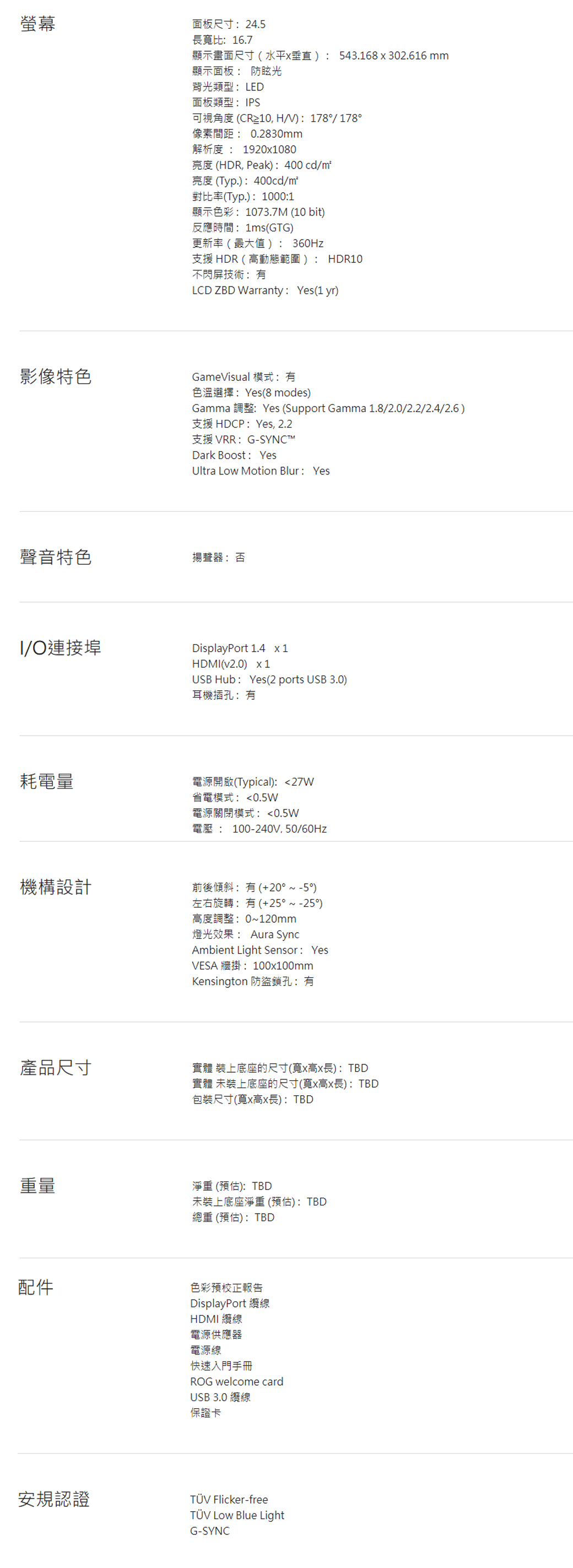 華碩 PG259QNR(ROG/1H1P/1ms/IPS/360Hz/無喇叭/G-sync/HDR10) AURA燈效