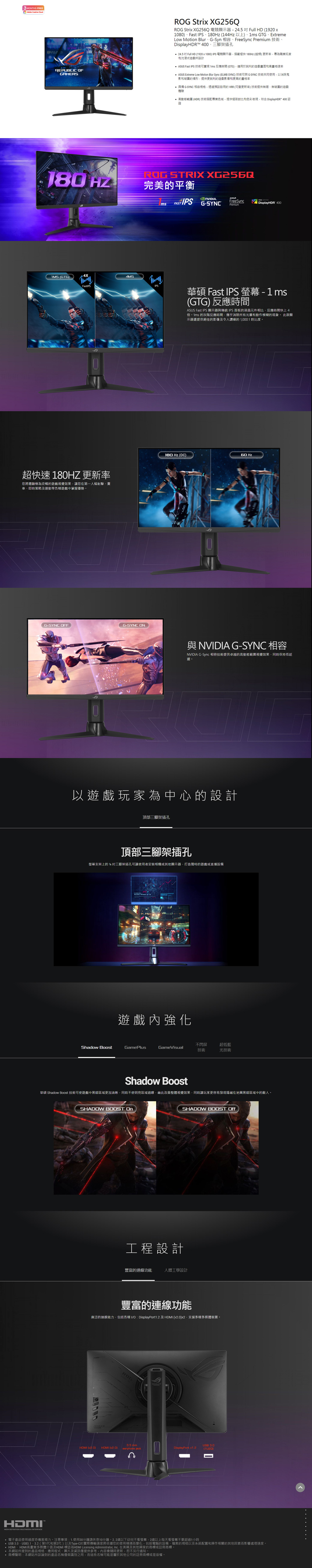 華碩 XG256Q(ROG/2H1P/1ms/IPS/180Hz/無喇叭/G-SYNC相容/HDR400)電競顯示器