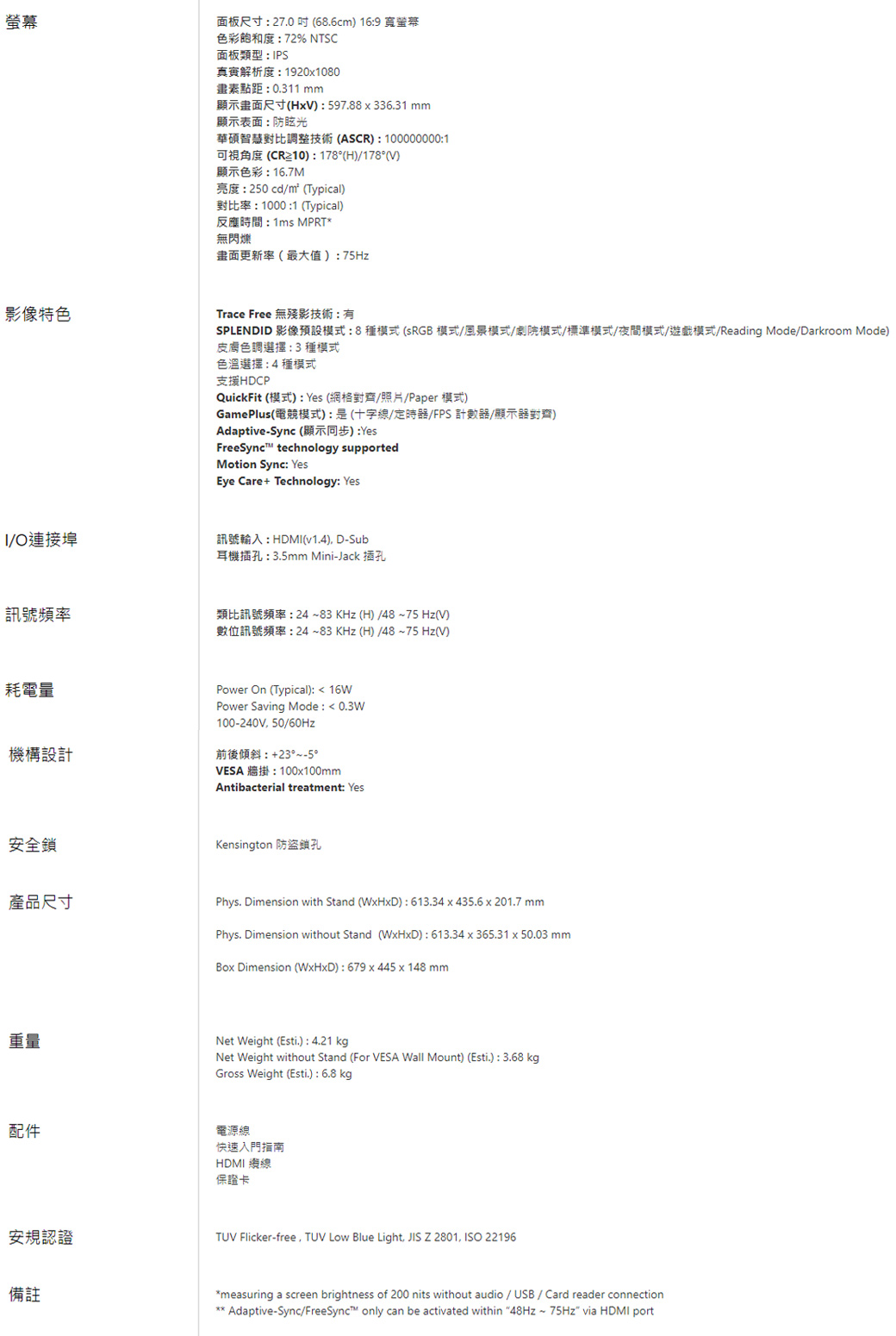 華碩 VY279HE(1A1H/1ms/IPS/無喇叭/FreeSync)護眼抗菌螢幕.低藍光.不閃屏