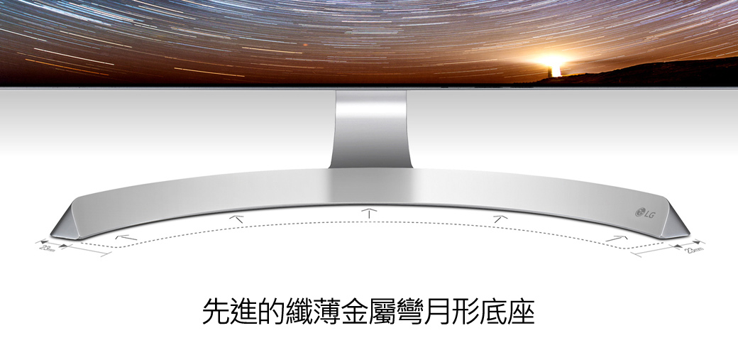 金屬纖薄彎月形底座凸顯了LG高級顯示器的圓滑設計,比現有的底座更薄些、更彎曲些。