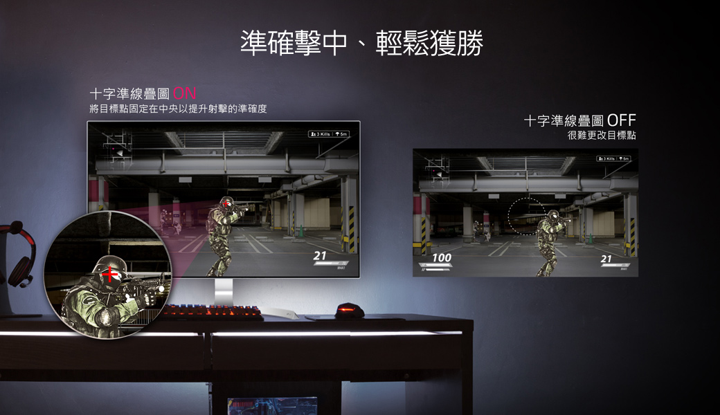 由於準星疊圖的特色,玩家可以將他們的技能帶到下一個遊戲程度。藉由將打擊點安排在面板中央,特色提升在第一人稱射擊遊戲中射中的準確度。