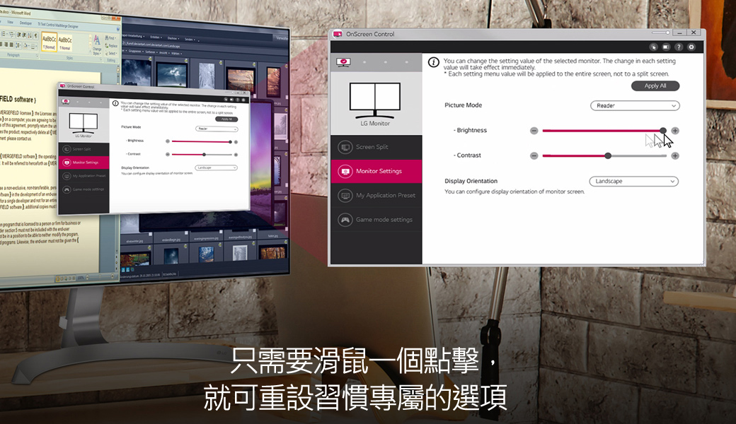 螢幕上控制與我的面板重設讓您只須點擊幾下滑鼠,就可輕鬆設定習慣專屬的顯示器。