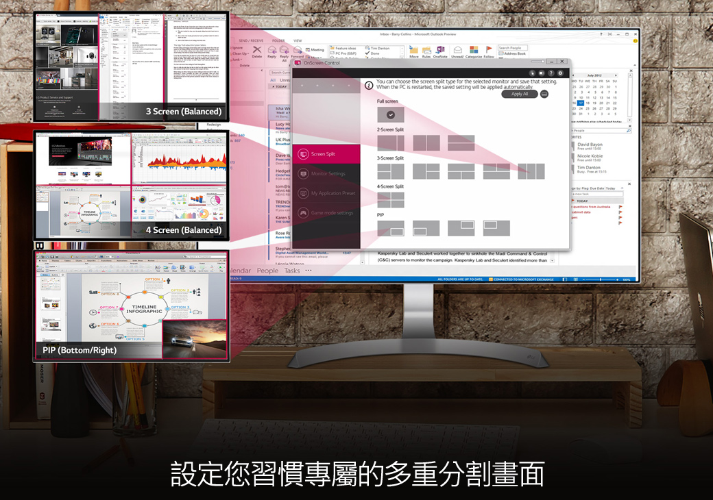 Screen Spilt 藉由重設螢幕畫面的大小,將面板分割成不同的畫面。有了PIP模式,您可以工作,同時觀賞螢幕上浮動式視窗內的一部影片。