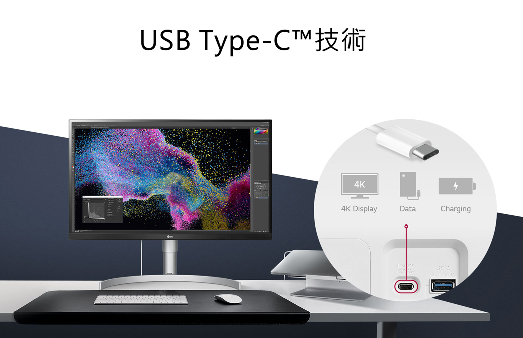 Display Connection 使用 USB Type-C™,與 MacBook 相容。透過單線運作,您可以傳送 4K 螢幕數據與其他數據時,同步為 MacBook 或任何高達 60W 的移動式裝置充電。
