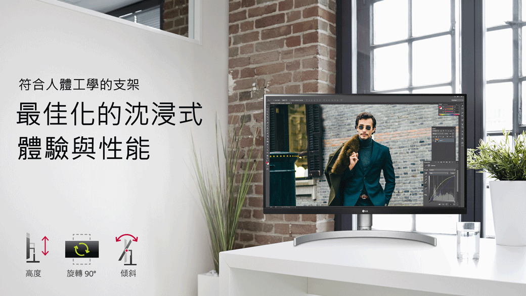 旋轉顯示器適用於任何可顯示直向資訊或攝影編輯的程式。高度調整功能也增加人體工學的方便性。