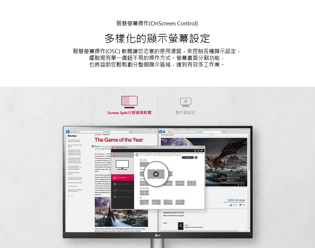 *須軟體下載以使用智慧螢幕操作OnScreen Control。關於下載細節,請瀏覽 LG.com。 *不事先通知智慧螢幕操作OnScreen Control軟體修改或更新。