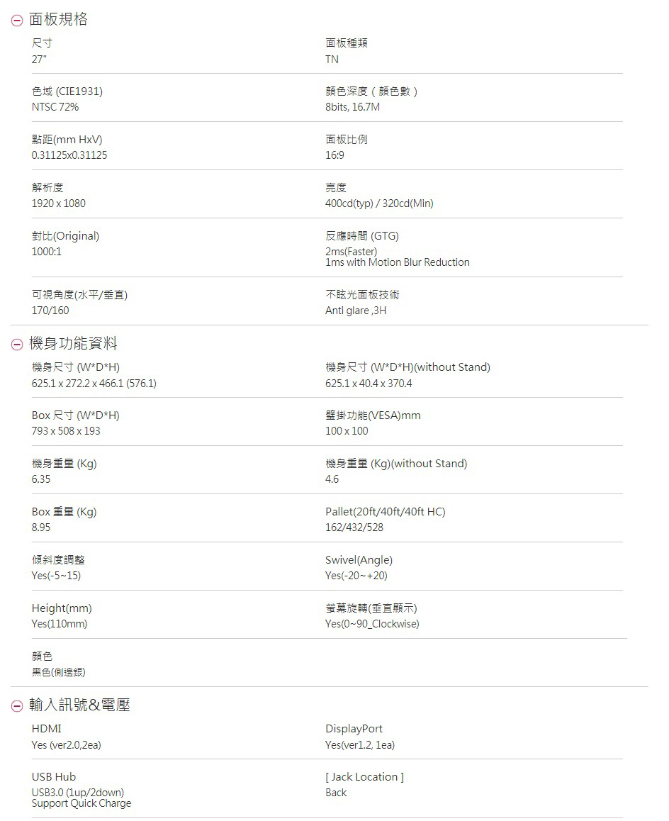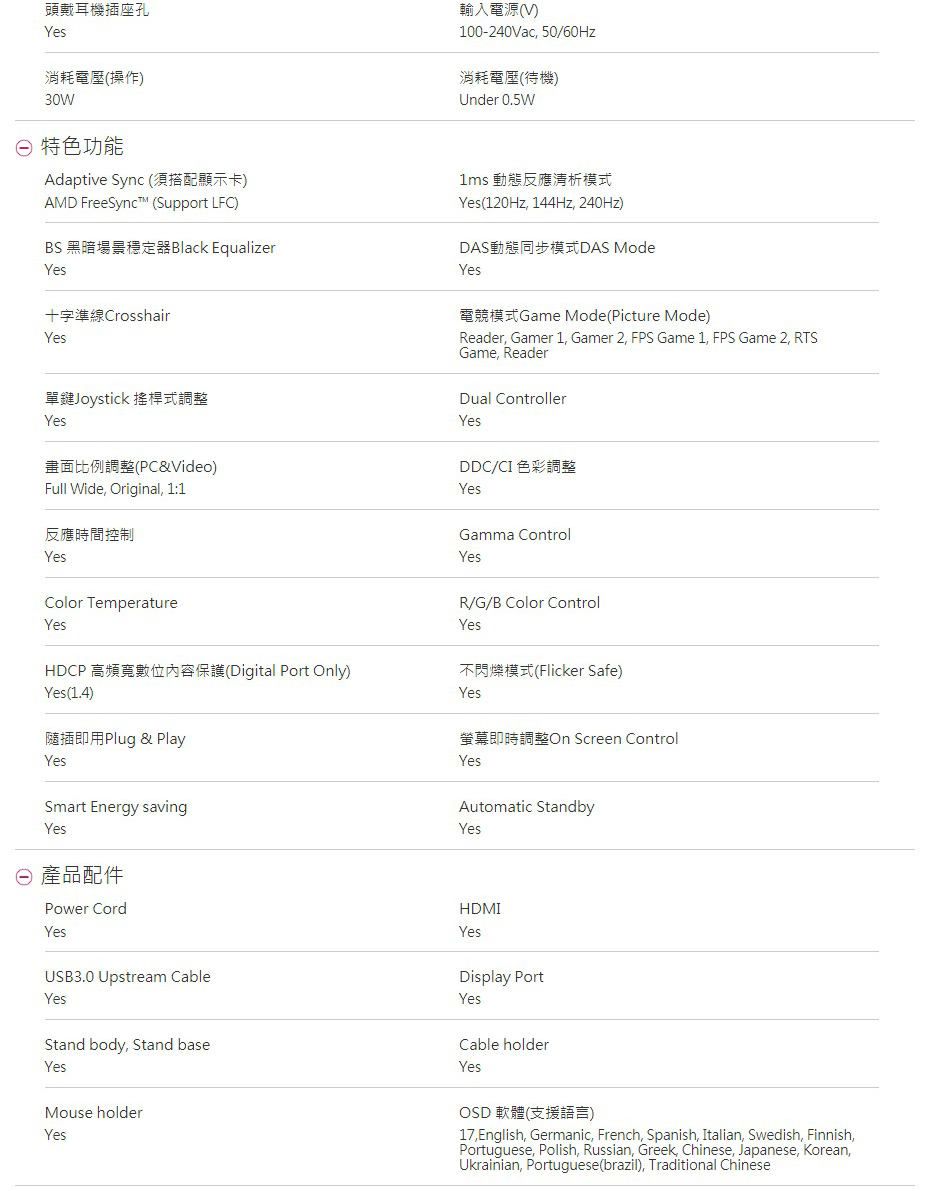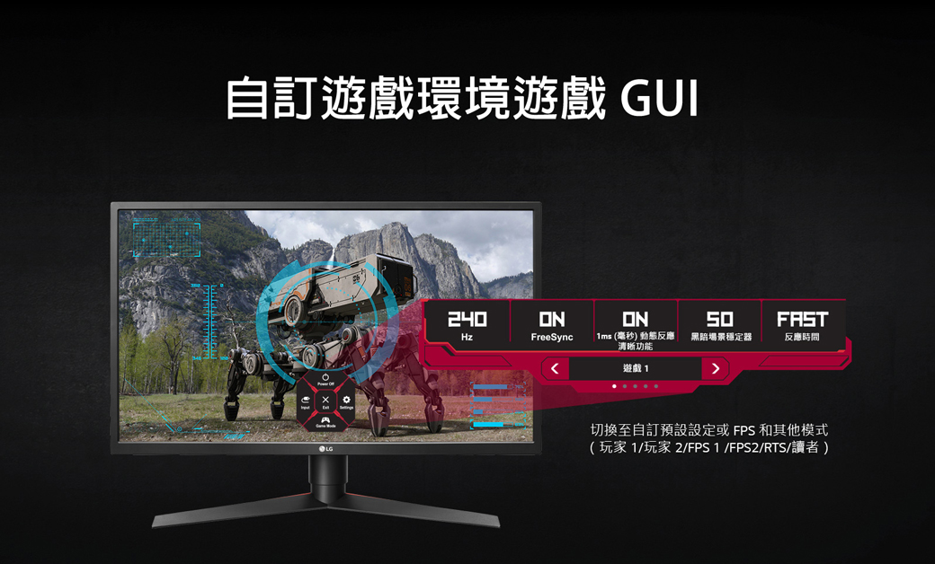 *1ms (毫秒) 動態反應清晰功能會導致亮度降低,啟動該功能時,無法使用以下功能:FreeSync /DAS(動態動作同步)