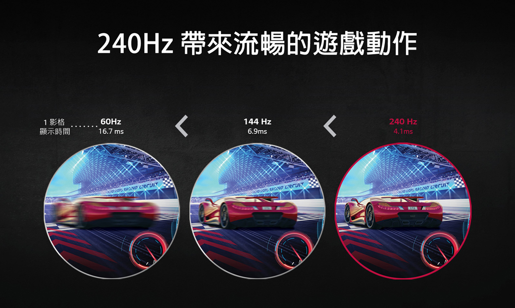240Hz 畫面刷新率搭配 1ms 反應速度(搭配動態反應清晰功能),讓您更快速沉浸於遊戲體驗。策略化達到極速。將對手拋在身後。240Hz 顯示器只需 4.1ms 就可顯示 1 個影格。如果是動作遊戲,這代表螢幕上專注且流暢的動態。